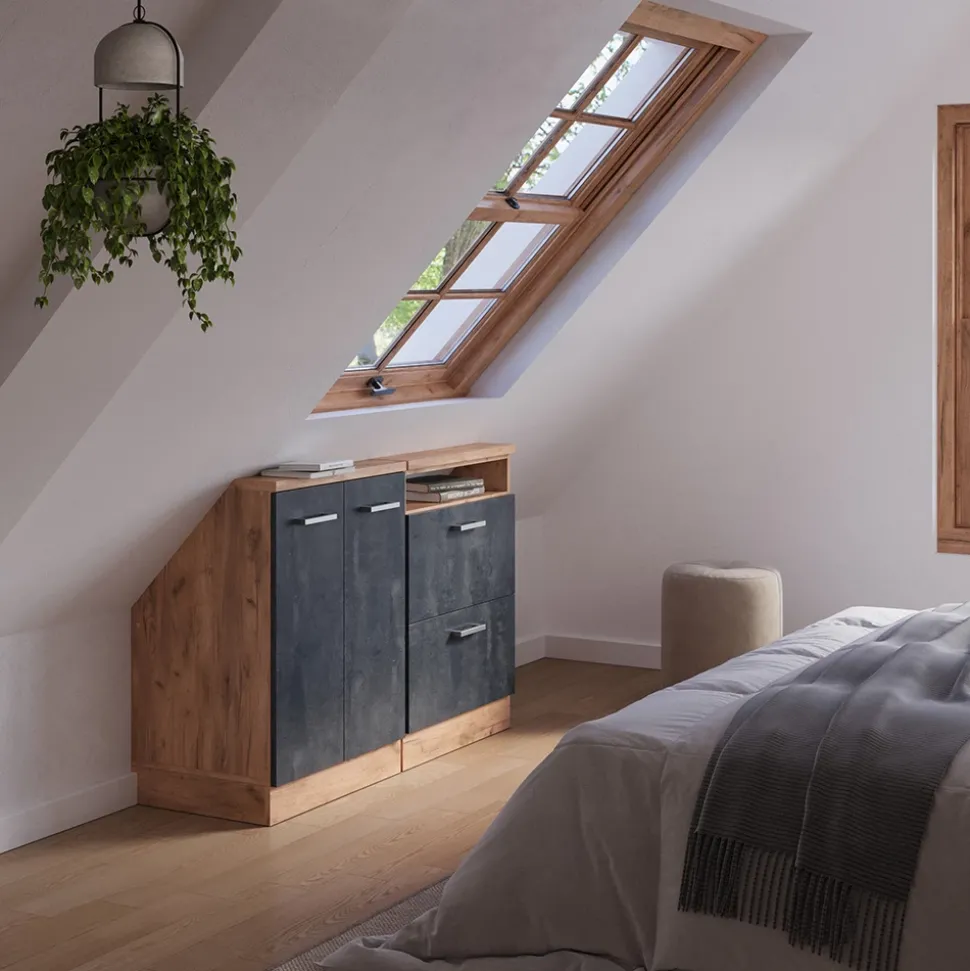 - Das Dachschrägenmöbel-Set besticht durch ein integriertes offenes Fach für zusätzlichen Stauraum und versteckte Füße für eine elegante Optik.