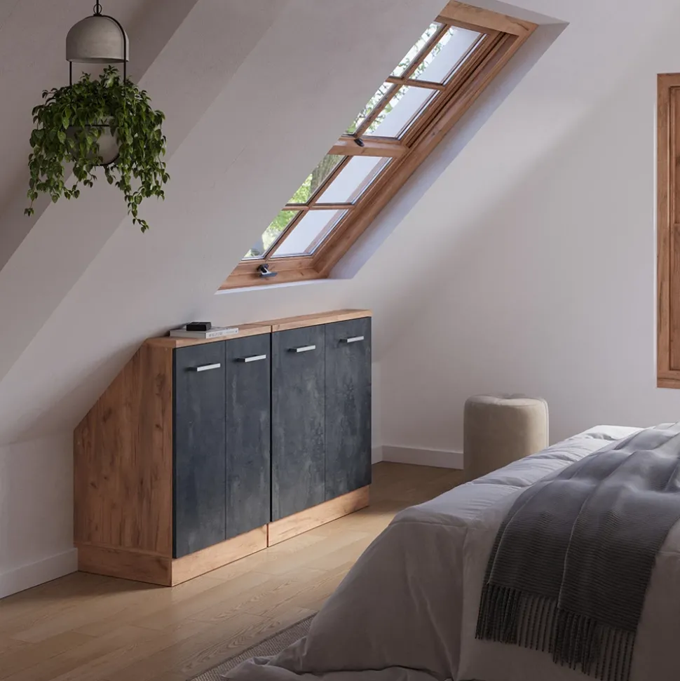 Der Dachschrägenschrank Rion ist eine durchdachte Lösung für Räume mit schrägen Wänden. Das speziell angepasste Schranksystem nutzt vorhandene Flächen effizient und schafft praktischen Stauraum. Mit seiner robusten Bauweise und den dezenten Griffen überzeugt Rion im Alltag durch Stabilität und Komfort. Die abgeschrägte Oberseite passt sich optisch harmonisch an. Eine clevere Wahl für mehr Ordnung und Platz unter dem Dach.