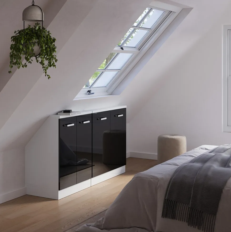 Der Dachschrägenschrank Rion ist die ideale Lösung, um den ungenutzten Platz unter Ihrer Dachschräge optimal zu nutzen. Mit seinen zwei Türen bietet er ausreichend Stauraum für Kleidung, Bücher oder andere Gegenstände. Die robuste Konstruktion und die schräge Oberseite machen den Schrank besonders stabil und passend für schräge Wände. Die bequemen Griffe und die versteckten Füße sorgen für ein harmonisches Gesamtbild und machen den Rion zu einem praktischen und stilvollen Möbelstück für Ihr Zuhause. Bringen Sie Ordnung in Ihre Dachschräge mit dem Dachschrägenschrank Rion!