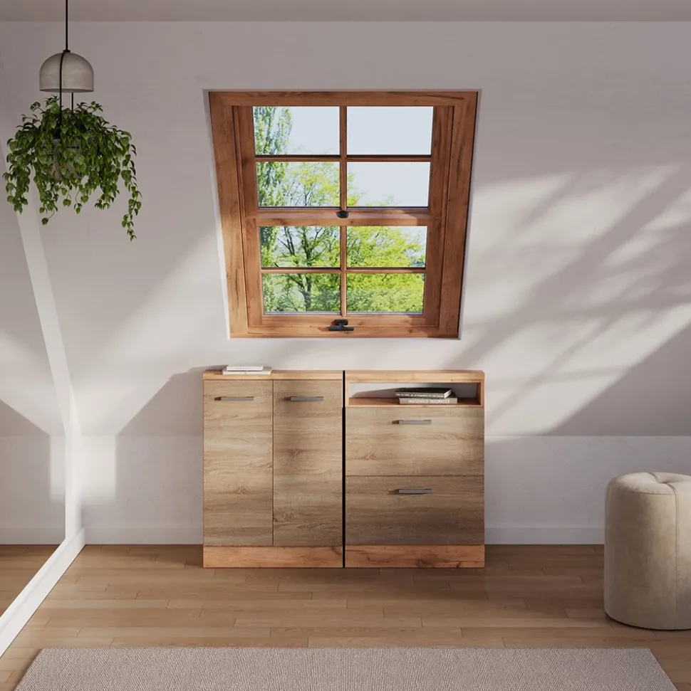 - Das Dachschrägenmöbel-Set besticht durch ein integriertes offenes Fach für zusätzlichen Stauraum und versteckte Füße für eine elegante Optik.