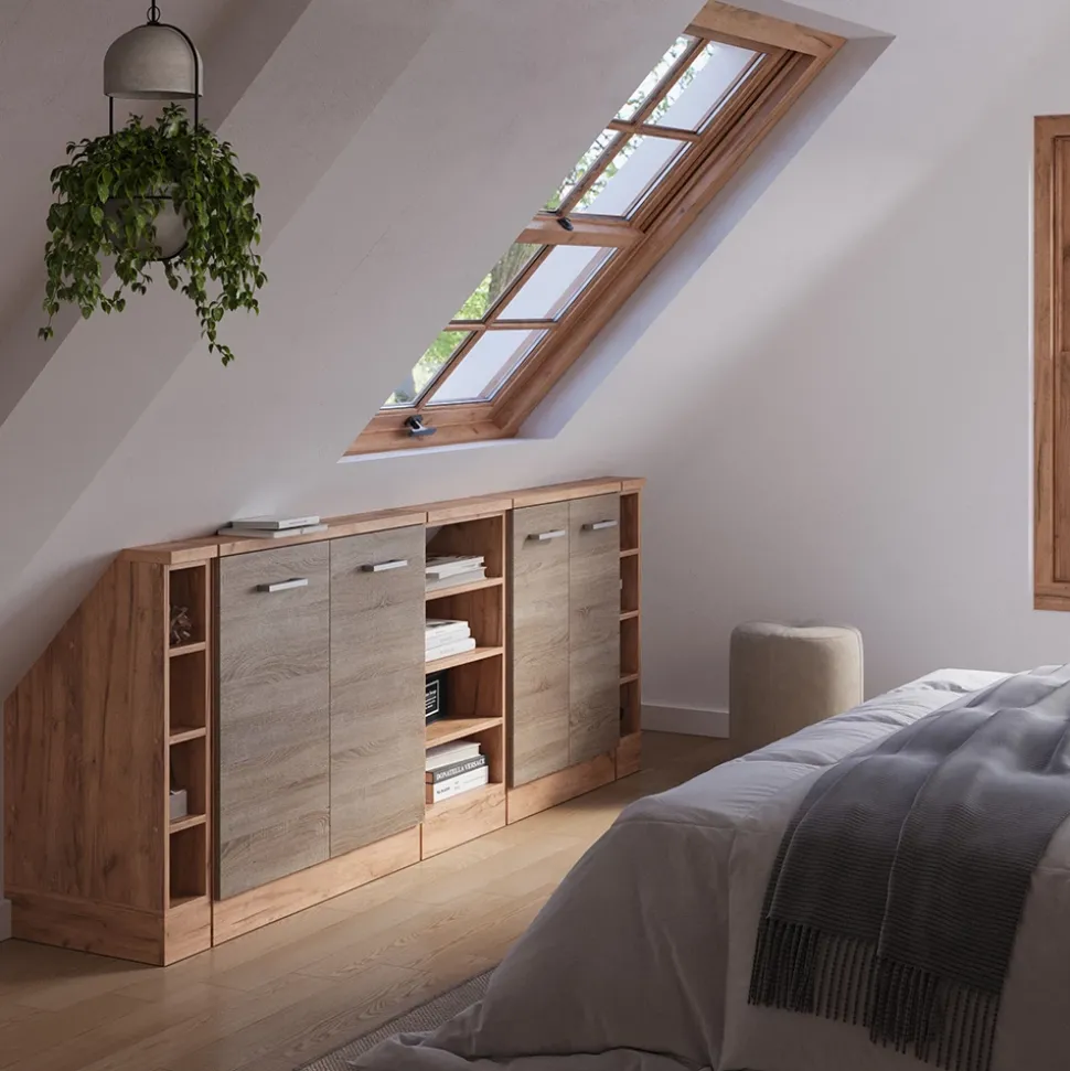 - Das Dachschrägenmöbel-Set besticht durch offene Seitenregale und eine robuste Konstruktion, perfekt für schräge Oberseiten in Dachgeschossen.