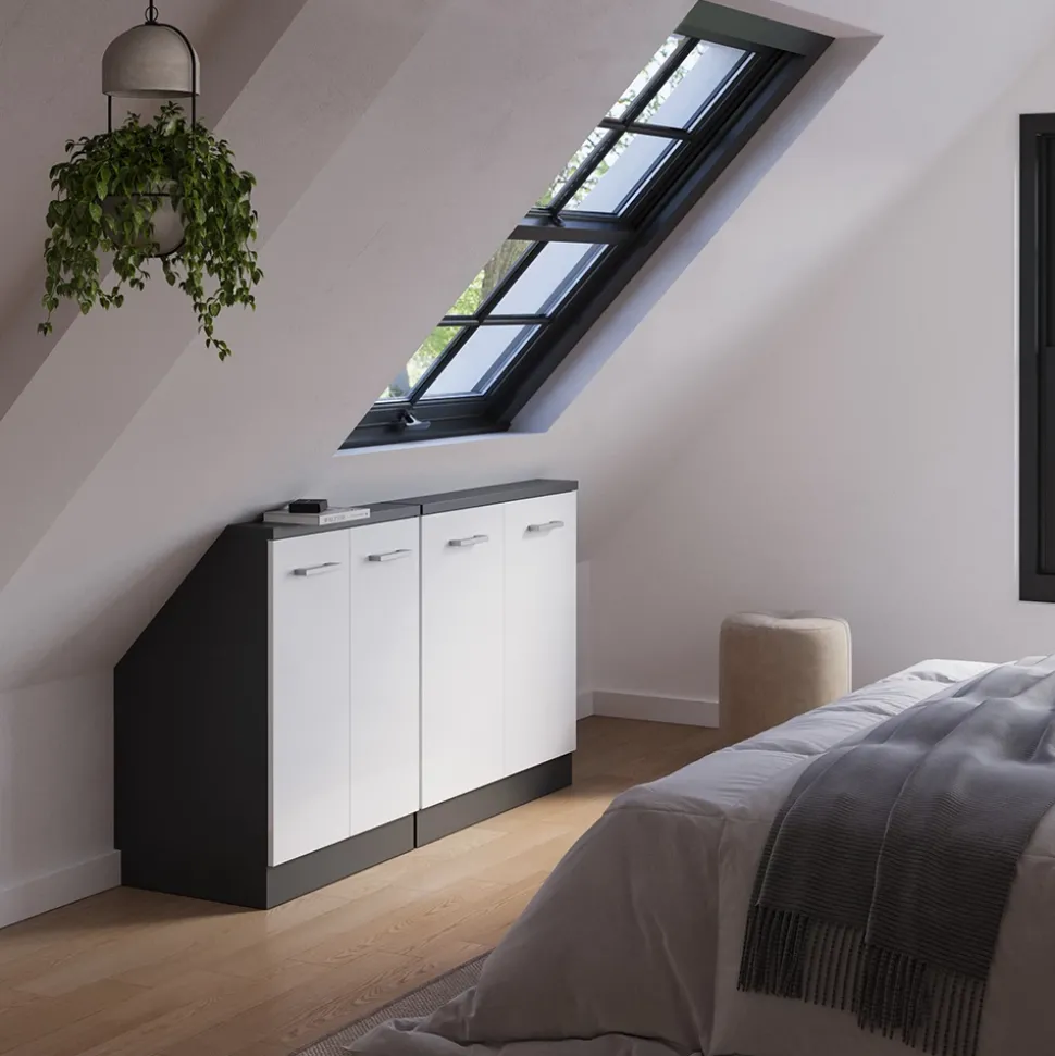 Der Dachschrägenschrank Rion ist eine intelligente Lösung für Räume mit schrägen Wänden. Das speziell angepasste Schranksystem nutzt den vorhandenen Platz effizient und schafft praktischen Stauraum. Mit robuster Bauweise und dezenten Griffen überzeugt Rion im Alltag durch Stabilität und Komfort. Die abgeschrägte Oberseite fügt sich optisch harmonisch ein. Eine clevere Wahl für mehr Ordnung und Stauraum unter dem Dach.