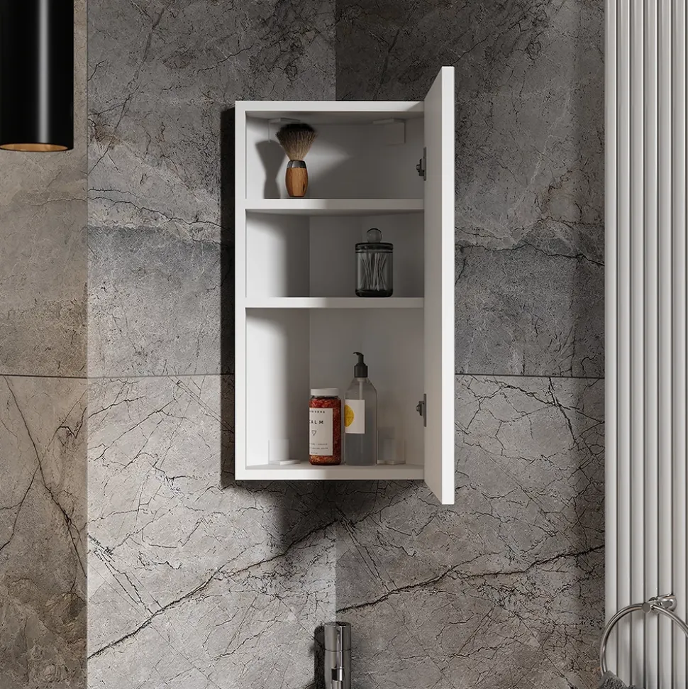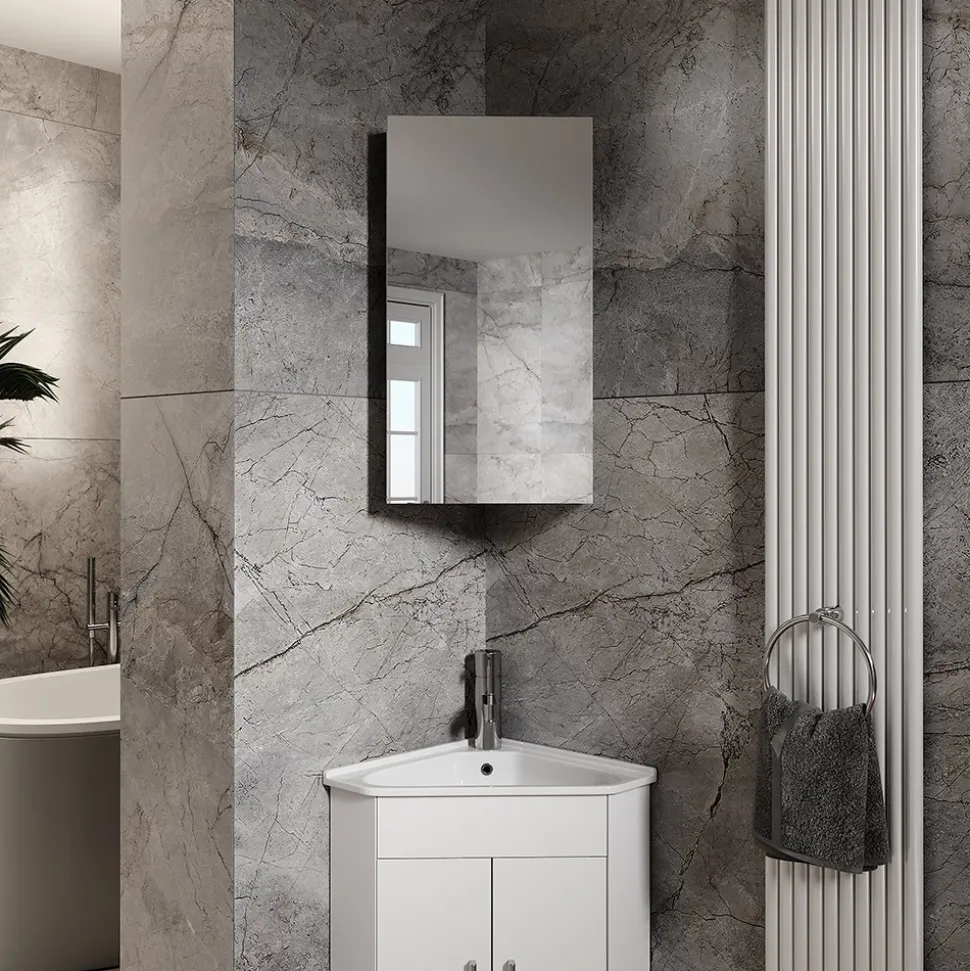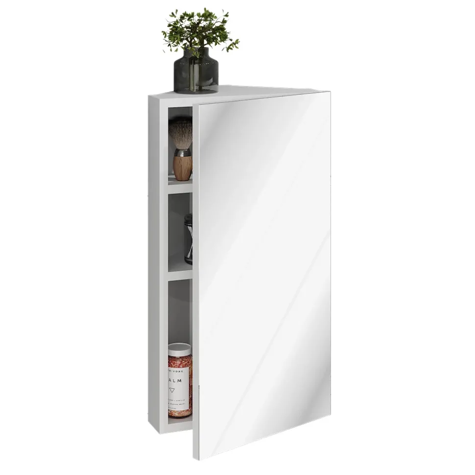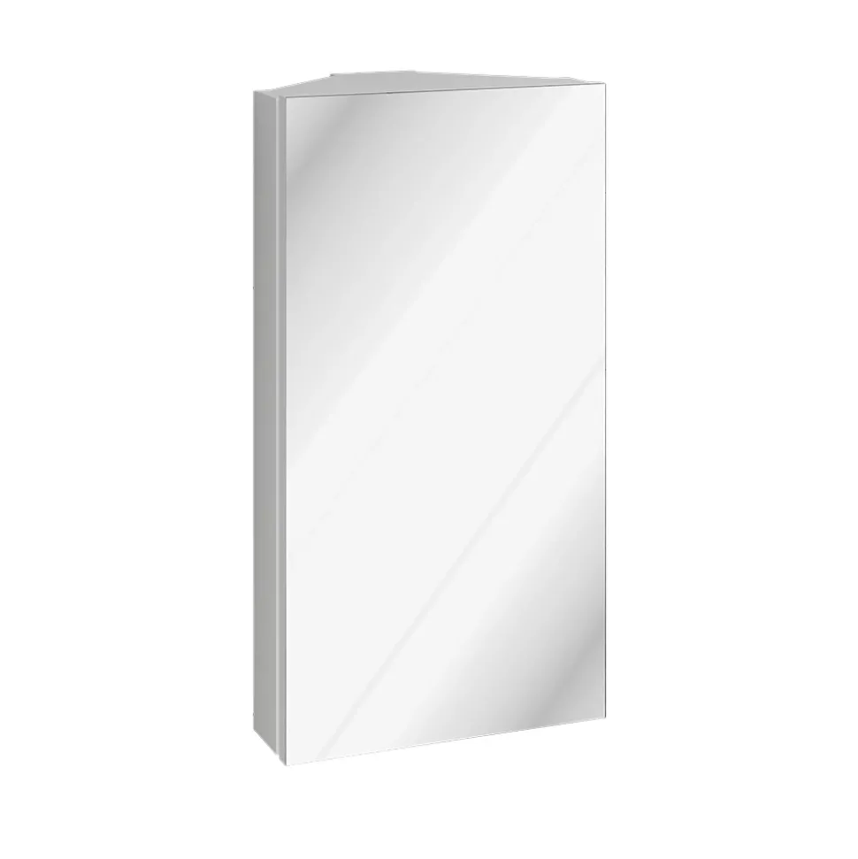 Der Eckspiegelschrank Anka ist ein platzsparender Badezimmerschrank mit Spiegel, der sich ideal für Ecken eignet. Mit seinem modernen Design und funktionalem Stauraum vereint er Stil und praktische Aufbewahrung in einem.