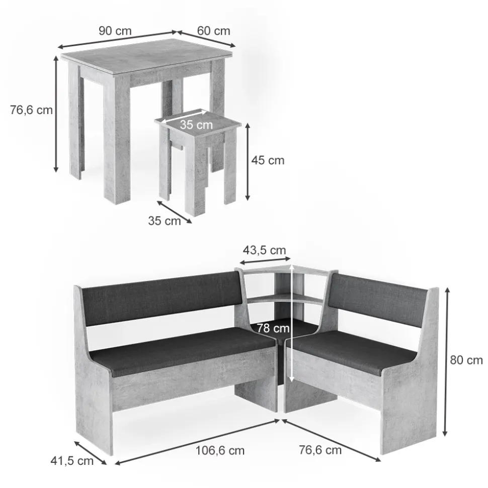 - MAßE: Die Bank hat folgende Abmessungen: Breite: 150×120 cm, Höhe: 80 cm, Tiefe: 41,5 cm. Größe des Esstisches: 90×76,6×60 Alle detaillierten Größen sind auf den Fotos angegeben.