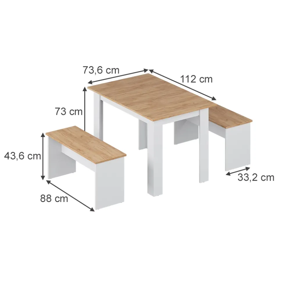 - MAßE: Der Küchentisch hat eine Breite von 73,6 cm, eine Höhe von 73 cm und eine Länge von 112 cm. Die detaillierte Größe anderer Teilen der Essgruppe sind auf den Fotos angegeben.
