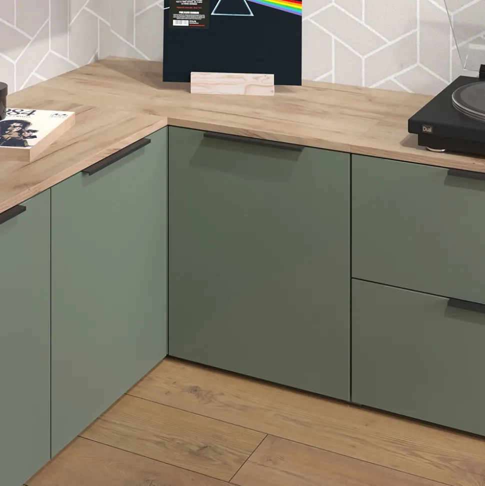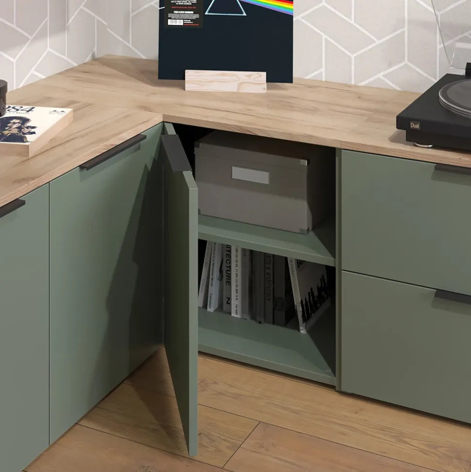 - MATERIAL: Die Eckkommode besteht aus pflegeleichter, melaminharzbeschichteter 16 mm Spanplatte.
