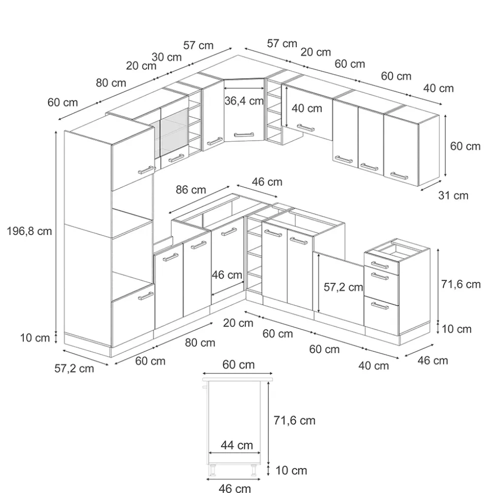 - MAßE: Die Küche L Form hat eine Breite von 287×227 cm, eine Höhe von 207 cm und eine Tiefe von 60 cm. Die Unterschränke haben eine Tiefe von 46 cm.
