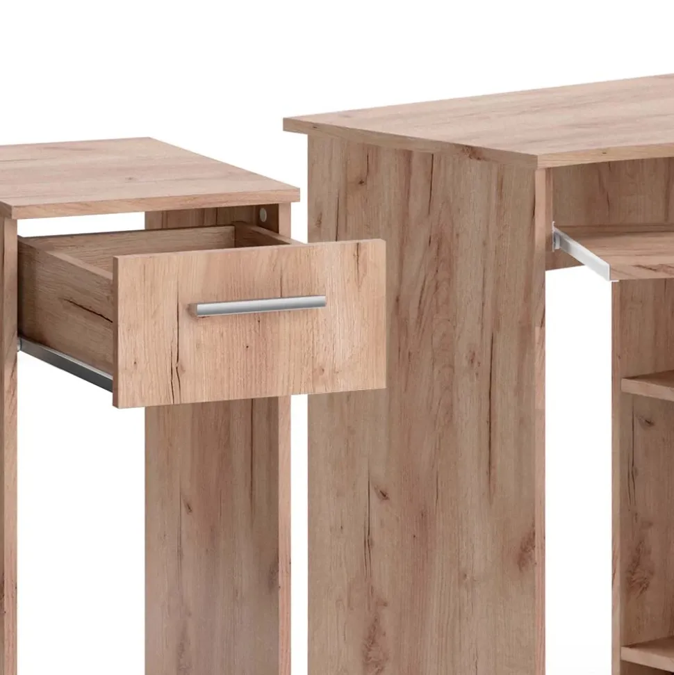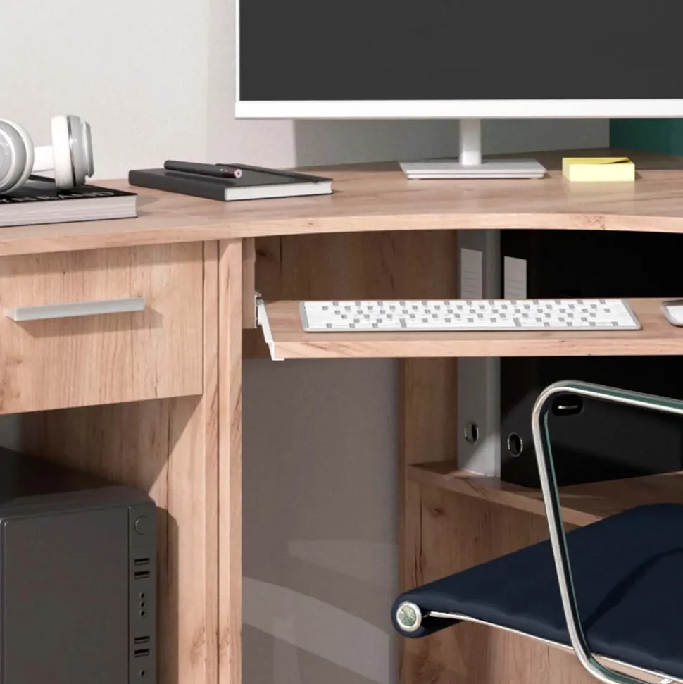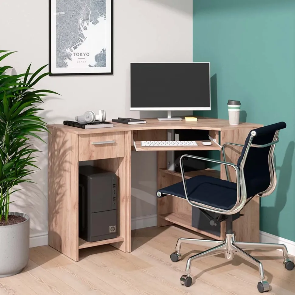 - Der Winkelschreibtisch verfügt über eine ausziehbare Schublade, eine Tastaturablage und ein Regal für die Systemeinheit.