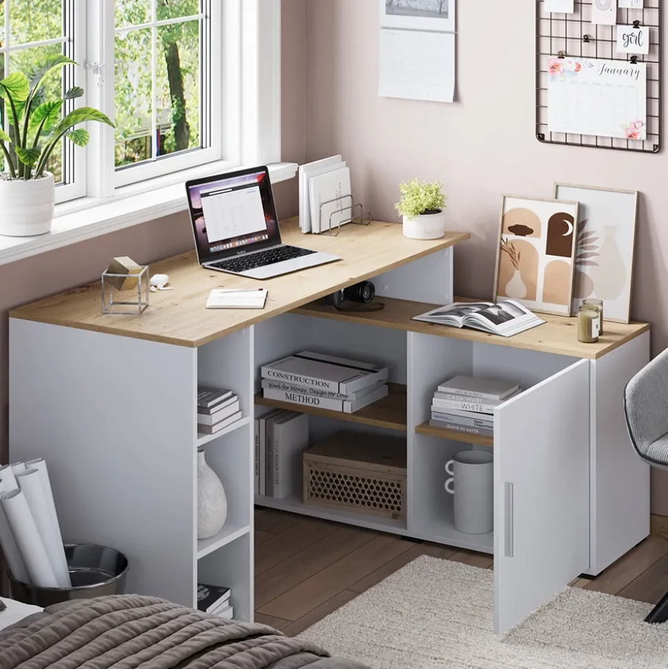 - MAßE: Der Schreibtisch in L-Form mit Regalen hat eine Tiefe von 110 cm, eine Breite von 135 cm und eine Höhe von 75,5 cm. Die detaillierten Größen sind auf den Fotos ersichtlich.