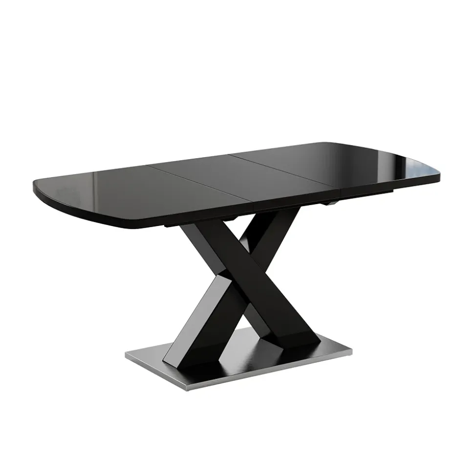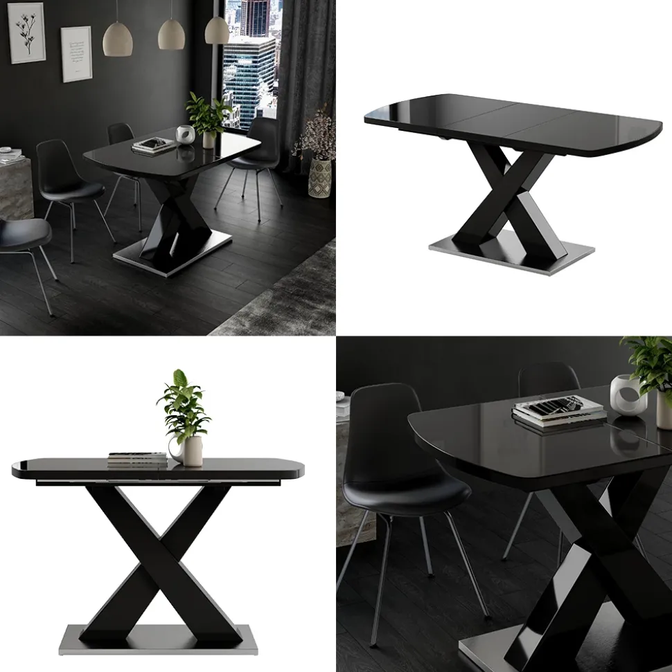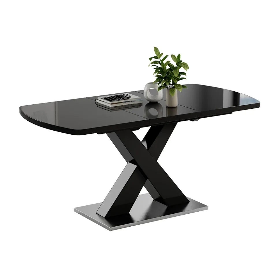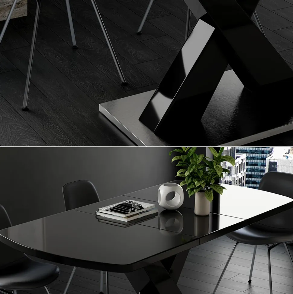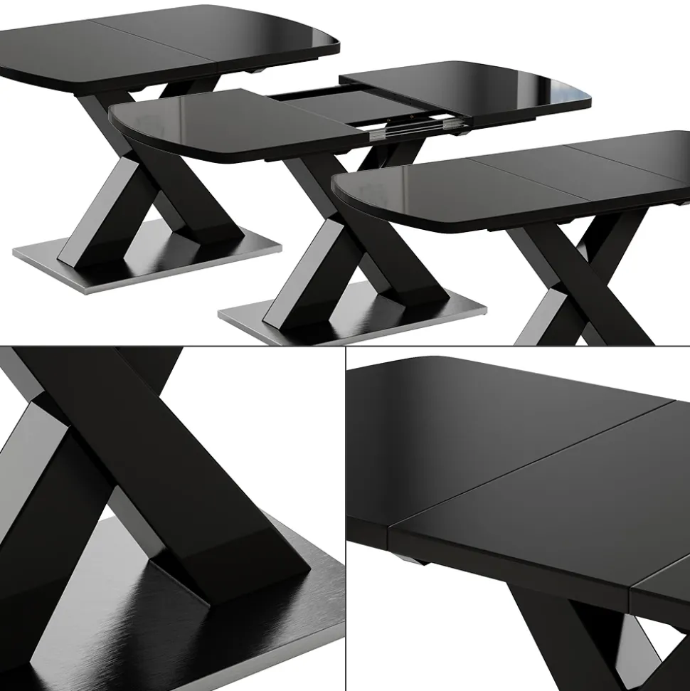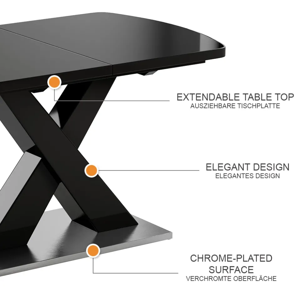 - Der ausziehbare Esszimmertisch verfügt über einen X-Fuß gebettet auf einem Podest und ist ein praktisches Möbelstück für das Esszimmer.