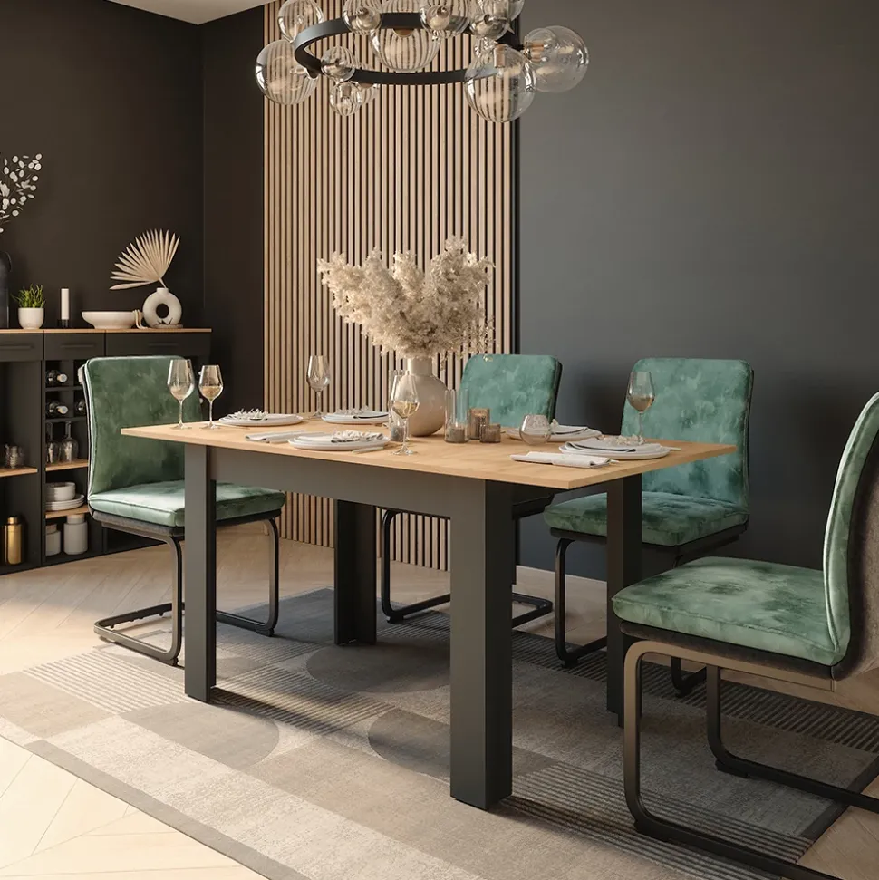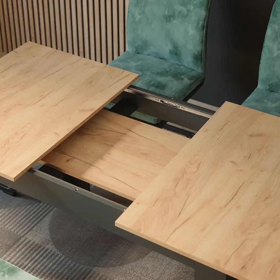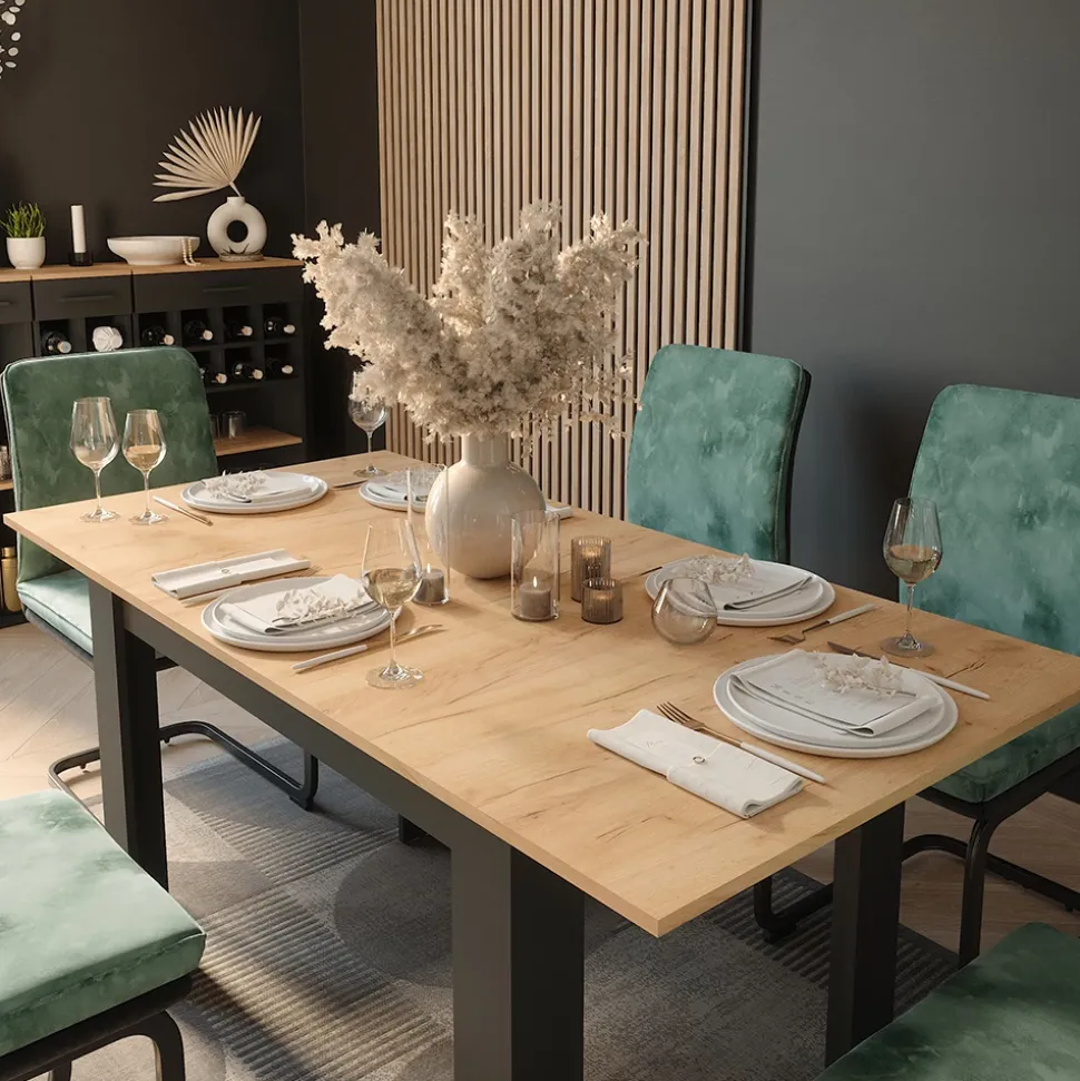 - Der ausziehbare Esszimmertisch verbindet modernes Design mit viel Platz für entspannte und gesellige Mahlzeiten.