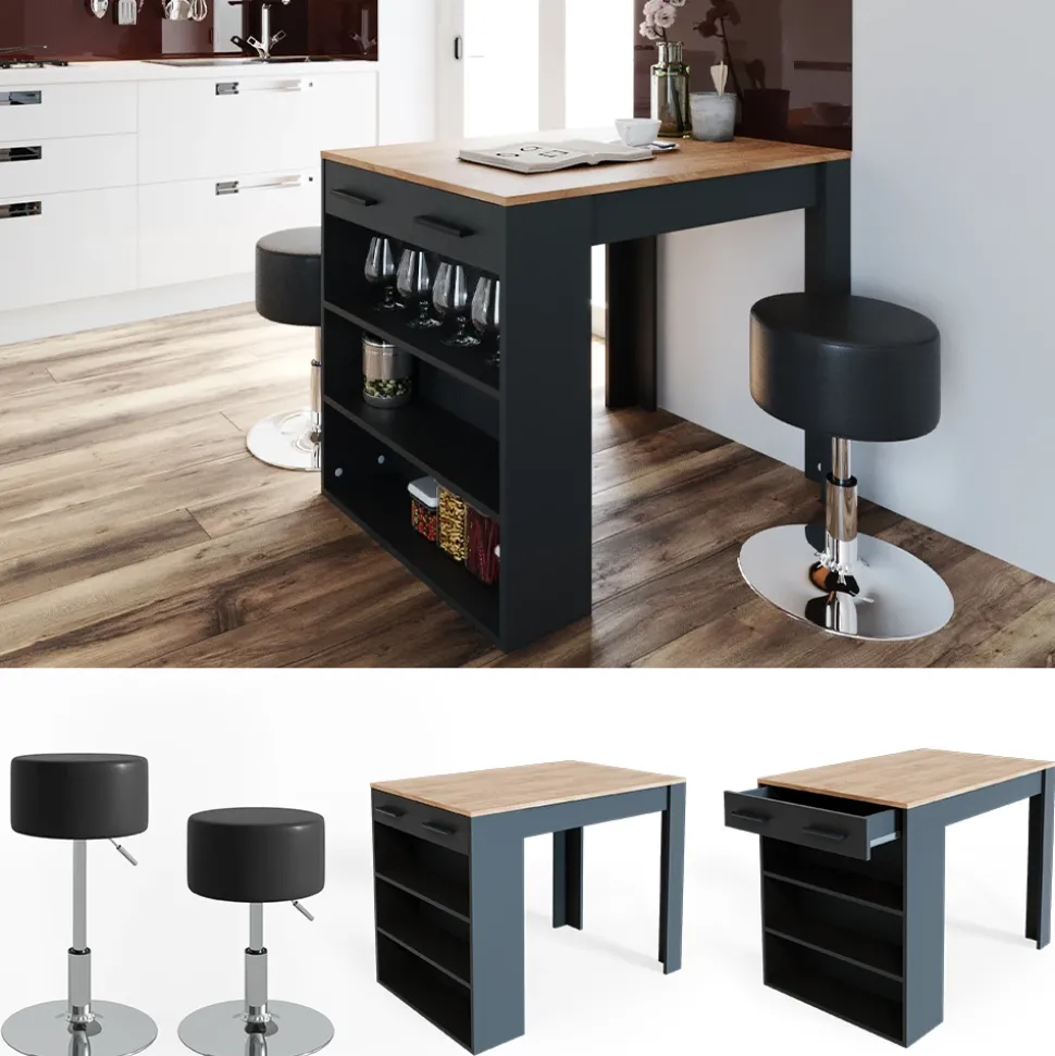 - Der Küchentisch mit Hocker bietet viele Ablagen zur Aufbewahrung und eignet sich ideal für kleine Räume dank seiner Breite und Funktionstauglichkeit.