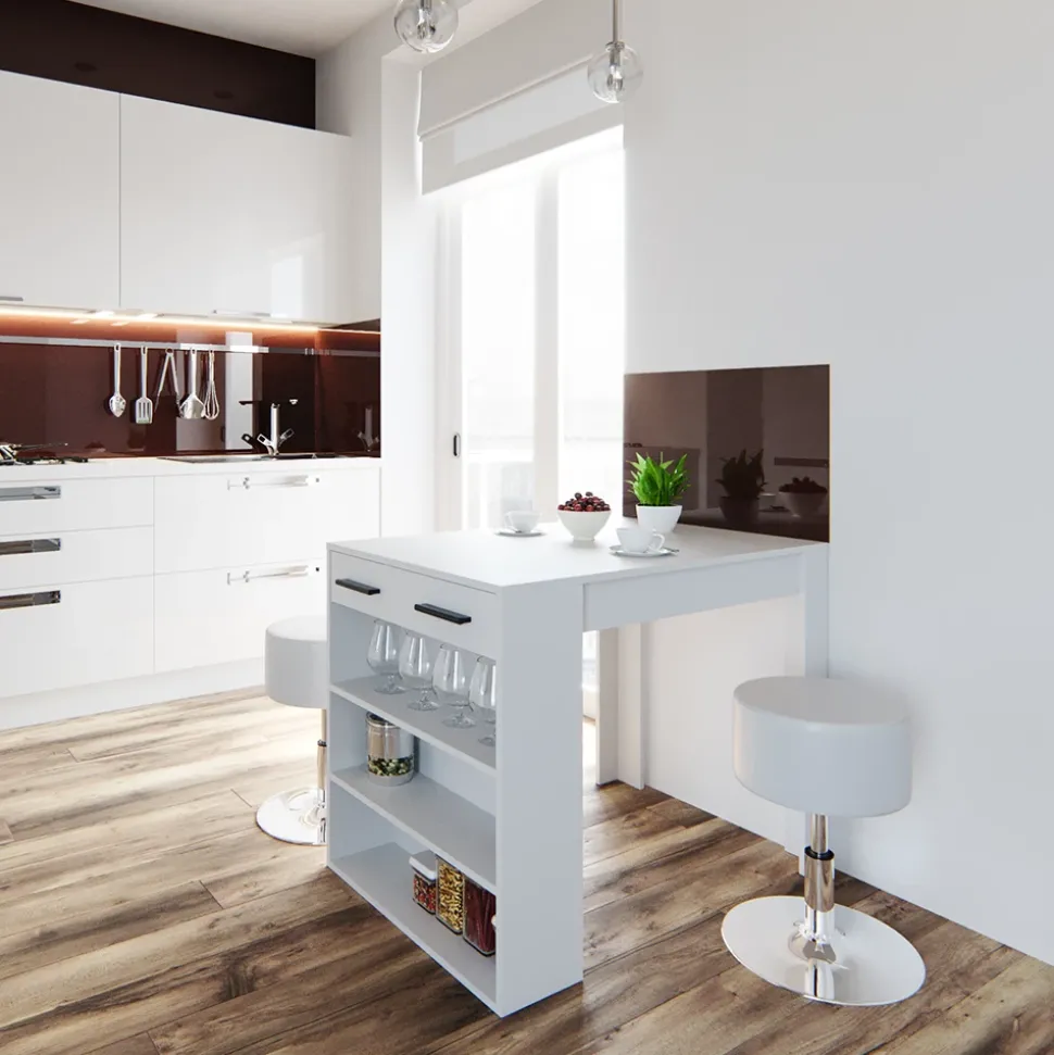 - Der Küchentisch mit Hocker bietet viele Ablagen zur Aufbewahrung und eignet sich ideal für kleine Räume dank seiner Breite und Funktionstauglichkeit.