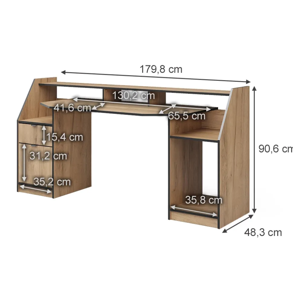 - MAßE: Der Gaming-Schreibtisch hat eine Breite von 179,8 cm, eine Höhe von 90,6 cm und eine Tiefe von 65,5 cm. Alle detaillierten Größen sind auf den Fotos angegeben.