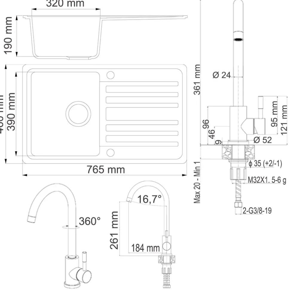 - LIEFERUMFANG: Spülbecken, Armatur, Montageanleitung, Montagematerial.