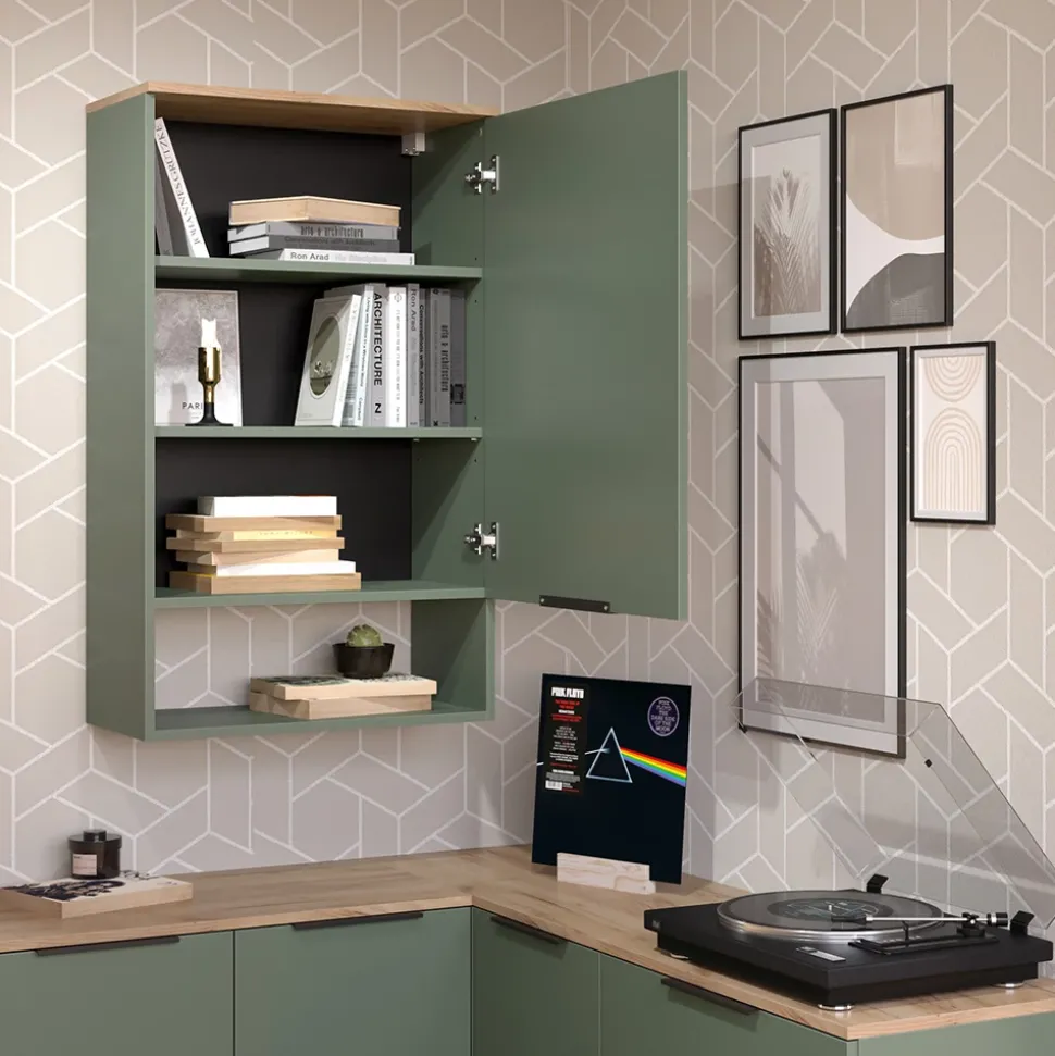 - Der Hängeschrank mit Tür bietet geschlossene Fächer und ein Regal für reichlich Stauraum.