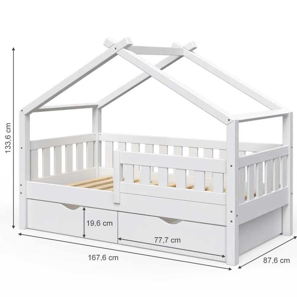 Das Hausbett ist mehr als nur ein Kinderbett aus Holz. Es ist ein Spielbereich und eine Quelle der Inspiration. Hier kann Ihr Kind seine Fantasie und Kreativität entfalten und in eine Welt voller Abenteuer eintauchen. Mit seinen zwei Schubladen bietet dieses Holzbett für Kinderzimmer auch praktischen Stauraum. Es ist ein Highlight im Kinderzimmer und zieht alle Blicke auf sich. Das Bett ist von hoher Qualität und in verschiedenen Ausführungen und zusätzlichen Veredelungen erhältlich. Das Hausbett ist das perfekte Spielbett für Kinder und ein gemütlicher Ort zum Schlafen. Gönnen Sie Ihrem Kind dieses unverwechselbare Design und schaffen Sie ein Zuhause, in dem es sich wohlfühlt und sein eigenes Reich erkunden kann.