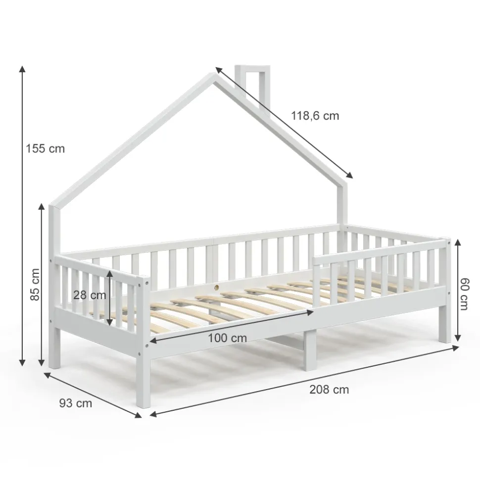 - MAßE: Das Hausbett ist passend für Matratzen 200 x 90 cm und hat eine Höhe von 155 cm. Die detaillierten Größen der einzelnen Teile sind auf den Fotos angegeben.