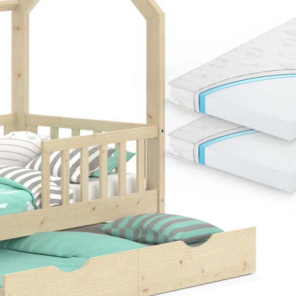 - LIEFERUMFANG: Hausbett, Montageanleitung, Montagematerial, 2x Matratzen.