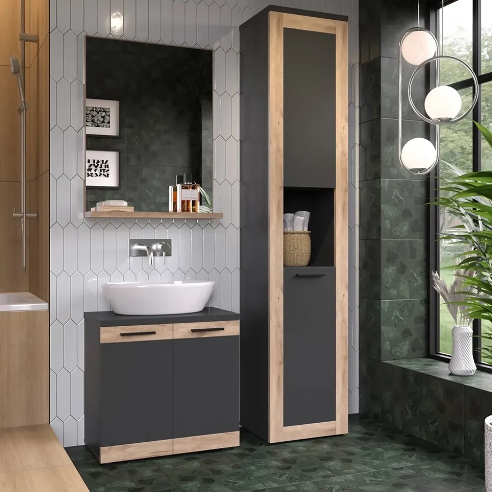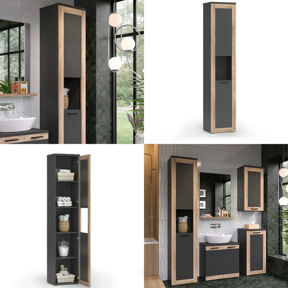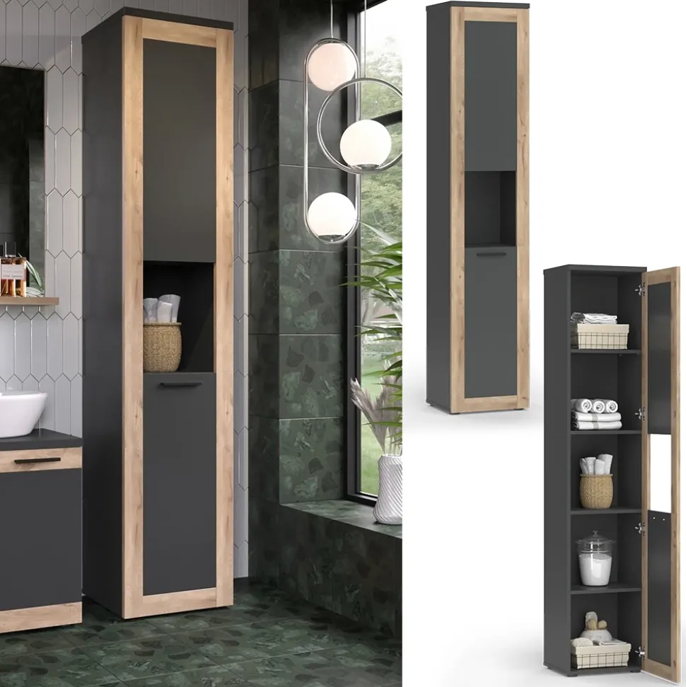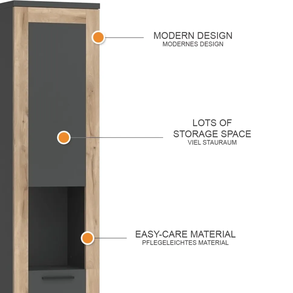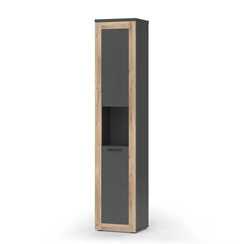 Der Hochschrank Niko in Anthrazit/Viking Oak besticht durch sein elegantes Design und seine praktische Aufteilung. Mit seiner Kombination aus offenen Fächern und geschlossenen Bereichen bietet er vielseitigen Stauraum für verschiedene Wohnbereiche.