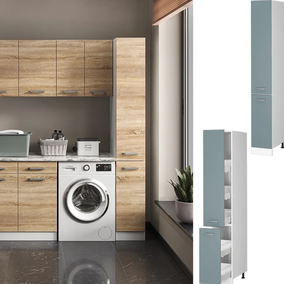 R-Line“ ist eine vielseitige Möbellinie mit Küchenzeilen, montagefertigen Komponenten und Schränken für den, Haushalts-, Wäsche- und Kreativbereich. Sie bietet eine breite Auswahl an Farben und Größen, die individuelle Lösungen für jeden Raum ermöglichen. Die Unterschränke sind mit verstellbaren Füßen ausgestattet, so dass sie einzeln oder als komplettes Set konfiguriert werden können, um den unterschiedlichen Bedürfnissen gerecht zu werden und die Funktionalität in verschiedenen Umgebungen zu verbessern.