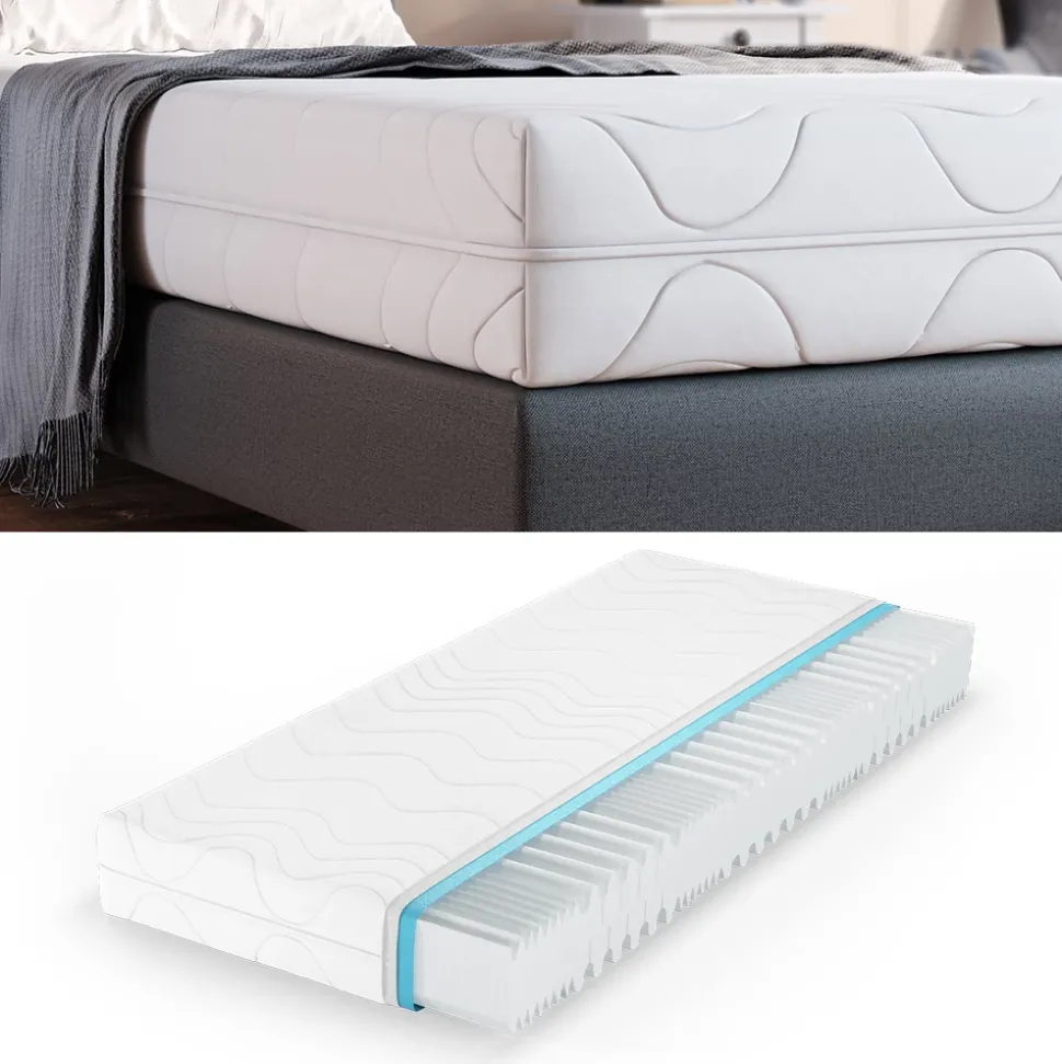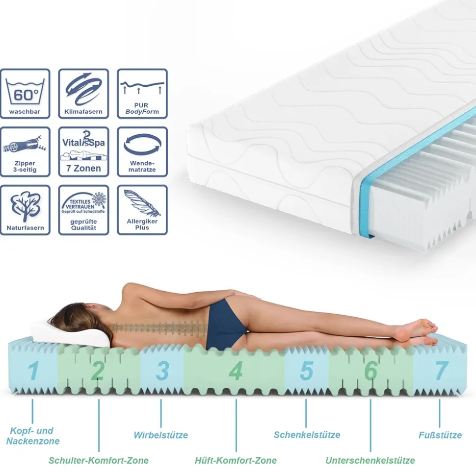 - Die 7-Zonen Matratze bietet eine perfekte Körperanpassung dank ihres Memory-Effekts. Der abnehmbare Bezug sorgt für zusätzliche Hygiene und einfache Reinigung.
