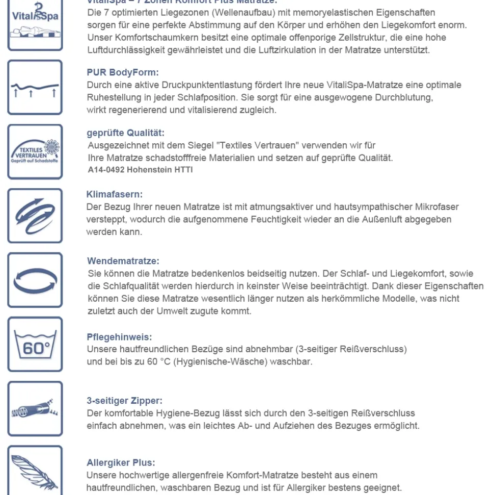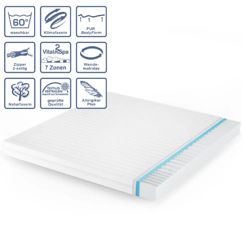 Entdecken Sie die perfekte Lösung für einen erholsamen Schlaf auf der Kaltschaummatratze H3 Härtegrad mit 7-Zonen und Memory-Effekt. Diese Wendematratze ist für Menschen über 80 kg konzipiert und sorgt durch ihre optimierte Wellenmuster-Sitzfläche für eine perfekte Körperanpassung und Druckentlastung. Der abnehmbare Bezug ermöglicht eine einfache Reinigung und hygienische Handhabung. Ob Sie auf dem Rücken oder der Seite schlafen, diese Schaummatratze bietet den perfekten Komfort und unterstützt Ihre Wirbelsäule für eine erholsame Nachtruhe. Erleben Sie das Gefühl von Luxus und Entspannung mit dieser Memory-Matratze und genießen Sie den Komfort von 7-Zonen-Schaumstofftechnologie. Investieren Sie in Ihre Gesundheit und erleben Sie pure Entspannung auf der Kaltschaummatratze H3 Härtegrad, 7-Zonen.