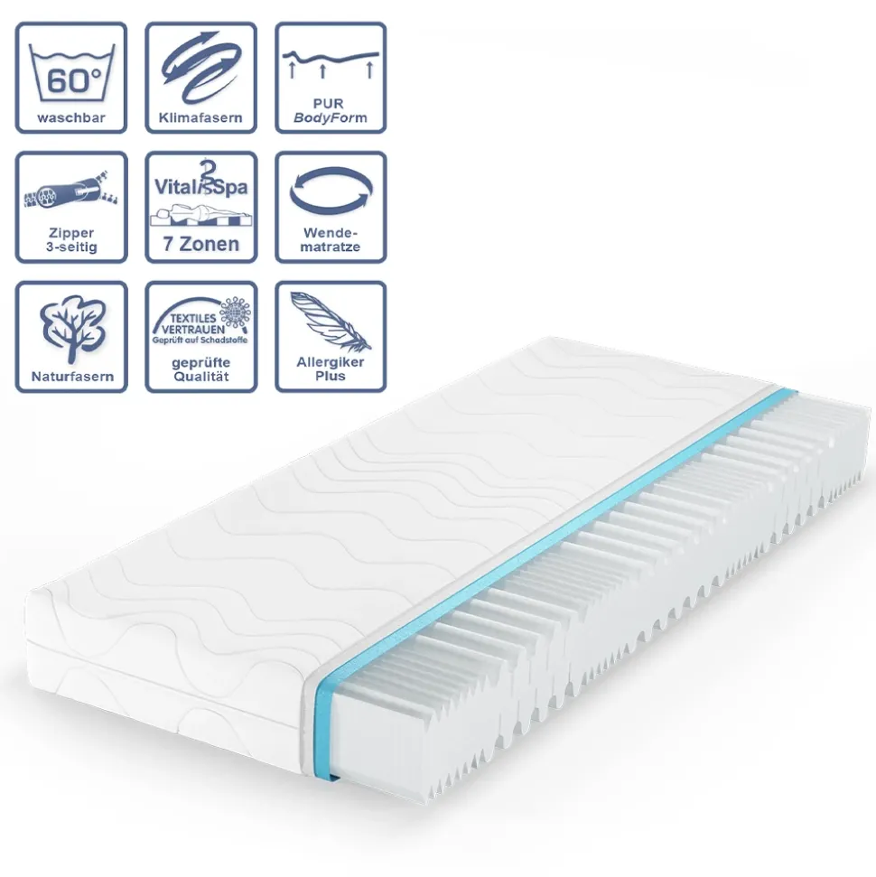 - Die 7-Zonen Matratze bietet eine perfekte Körperanpassung dank ihres Memory-Effekts. Der abnehmbare Bezug sorgt für zusätzliche Hygiene und einfache Reinigung.
