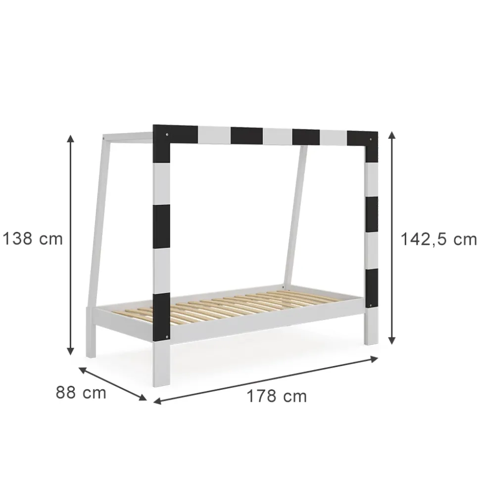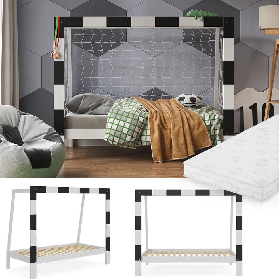 Das Kinderbett, Fußballtor ist das perfekte Möbelstück für kleine Fußballfans. Mit seinem funktionellen Design und der angenehmen Höhe ist es speziell für Kinder konzipiert. Das Bett lässt sich leicht mit anderen Möbeln kombinieren und macht das Kinderzimmer zu einem interessanteren Ort. Es wird ohne Netz geliefert, was es zu einem vielseitigen Möbelstück macht. Stellen Sie sich vor, wie sich Ihr Kind fühlen wird, wenn es sich in dieses coole Bett legt und von Fußball träumt. Überraschen Sie Ihr Kind mit diesem einzigartigen und funktionalen Bett und machen Sie seinen Schlafbereich zum Highlight in seinem Raum.