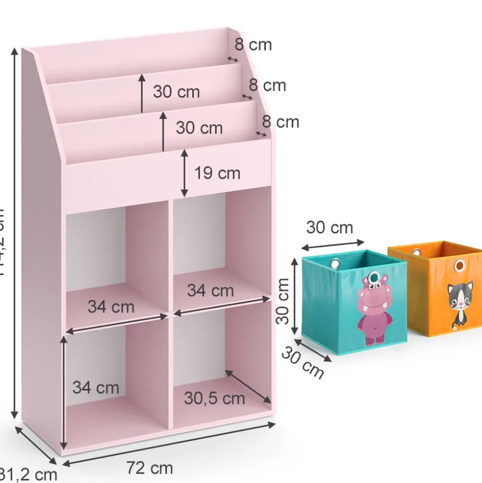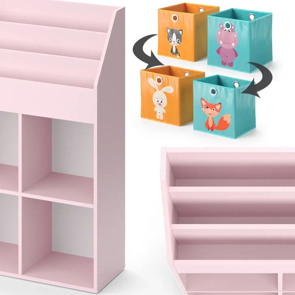 - Ergänzen Sie das Kinderzimmer mit dem Kinderbücherregal Luigi: Clevere Aufbewahrung für Bücher, Spielzeug und mehr. Stilvoll in Rosa mit Faltboxen – ideales Standregal für Mädchen.