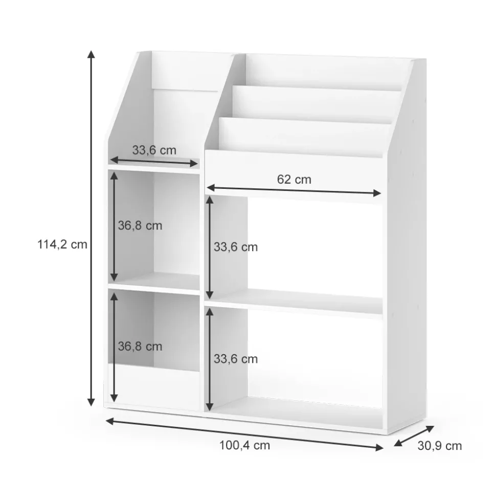 - MAßE: Das Bücherregal für Kinder hat folgende Abmessungen: Breite: 100,4 cm, Höhe: 114,2 cm, Tiefe: 30,9 cm. Alle detaillierten Größen sind auf den Fotos angegeben.