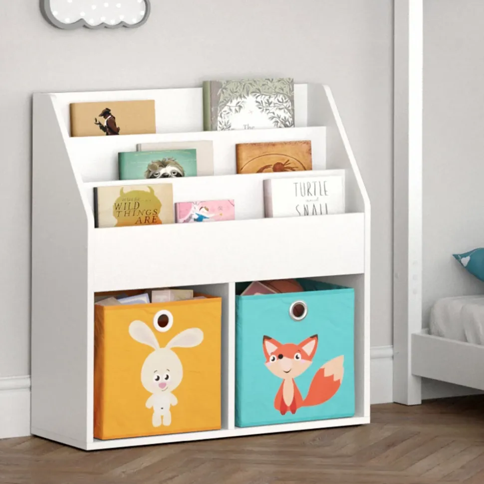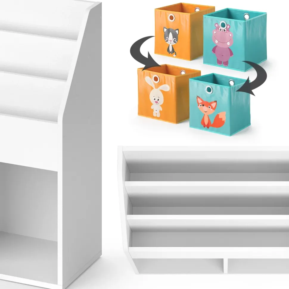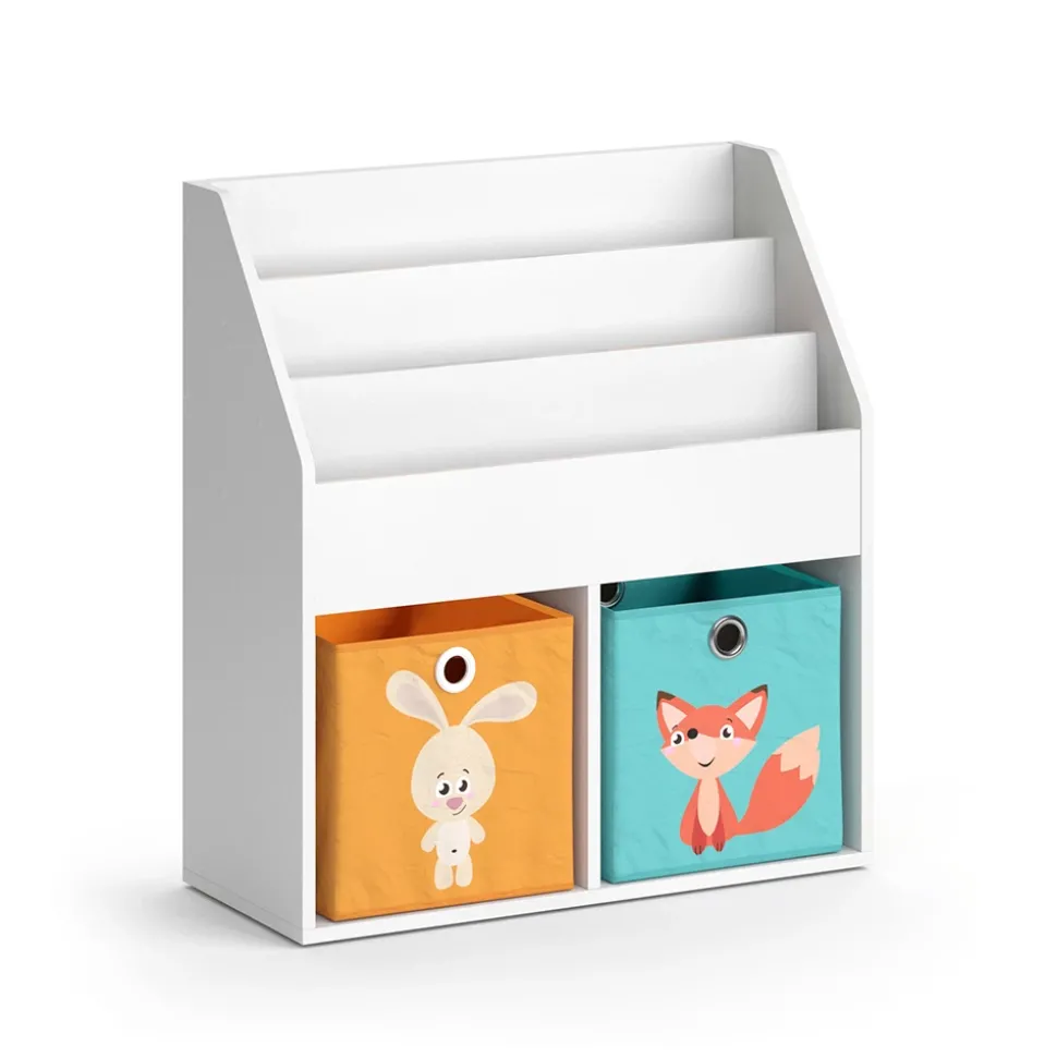 - Das Spielzeugregal für Faltboxen bietet bequeme Aufbewahrungsmöglichkeiten für Bücher und Spielzeug dank drei offener Ablagen und zwei Box-Fächern.