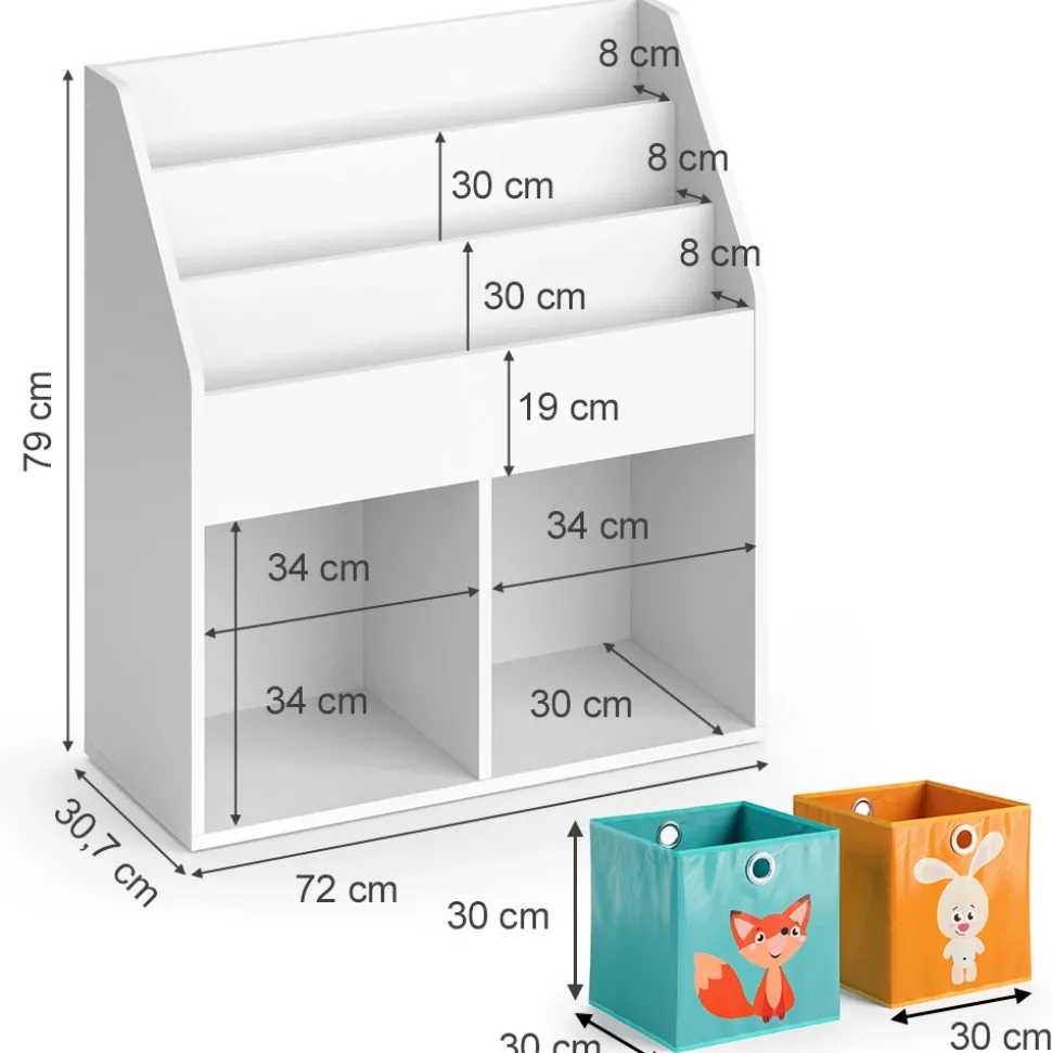 - MAßE: Das Bücherregal für Kinder hat eine Breite von 72 cm, eine Höhe von 79 cm und eine Tiefe von 30,7 cm. Alle detaillierten Größen sind auf den Fotos angegeben.