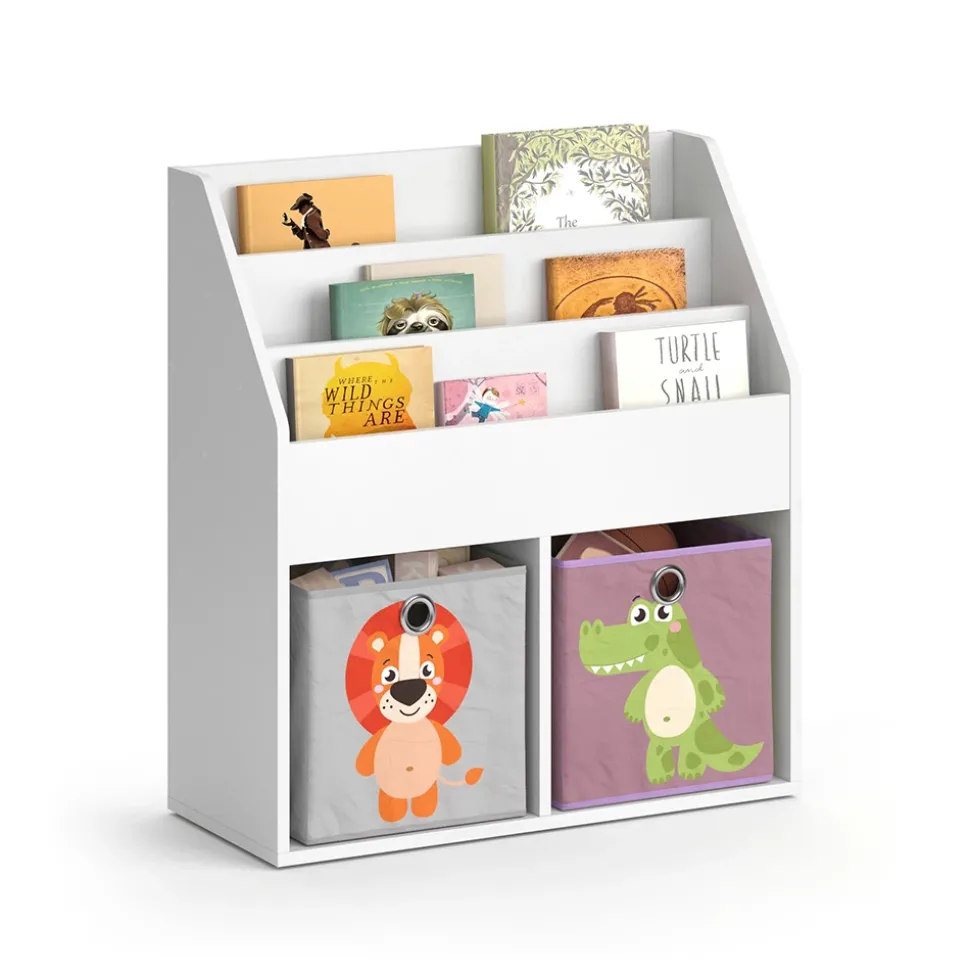 - Das Spielzeugregal für Faltboxen bietet bequeme Aufbewahrungsmöglichkeiten für Bücher und Spielzeug dank drei offener Ablagen und zwei Box-Fächern.