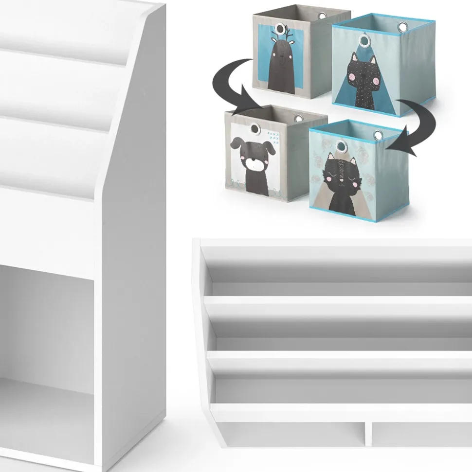 - Das Spielzeugregal für Faltboxen bietet bequeme Aufbewahrungsmöglichkeiten für Bücher und Spielzeug dank drei offener Ablagen und zwei Box-Fächern.