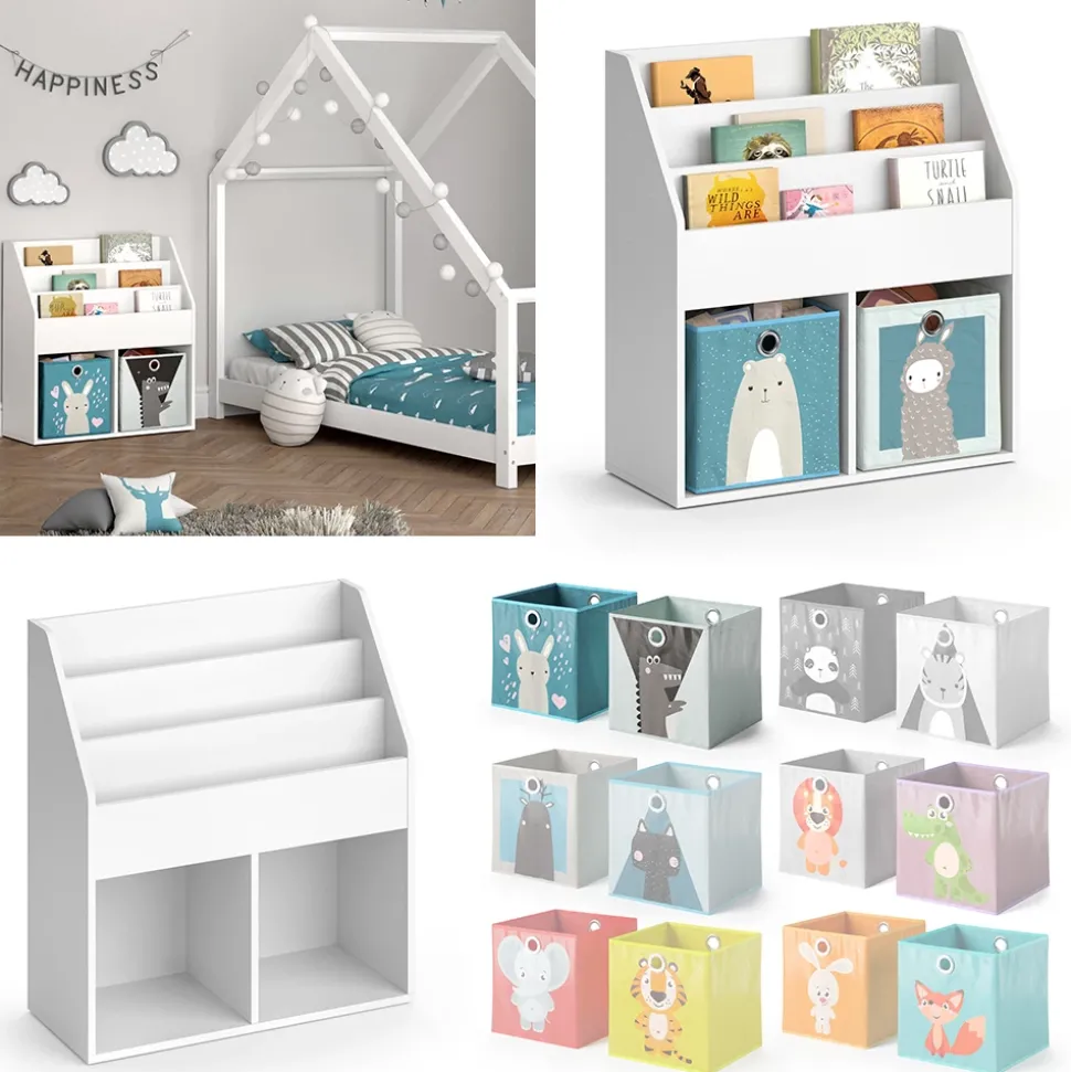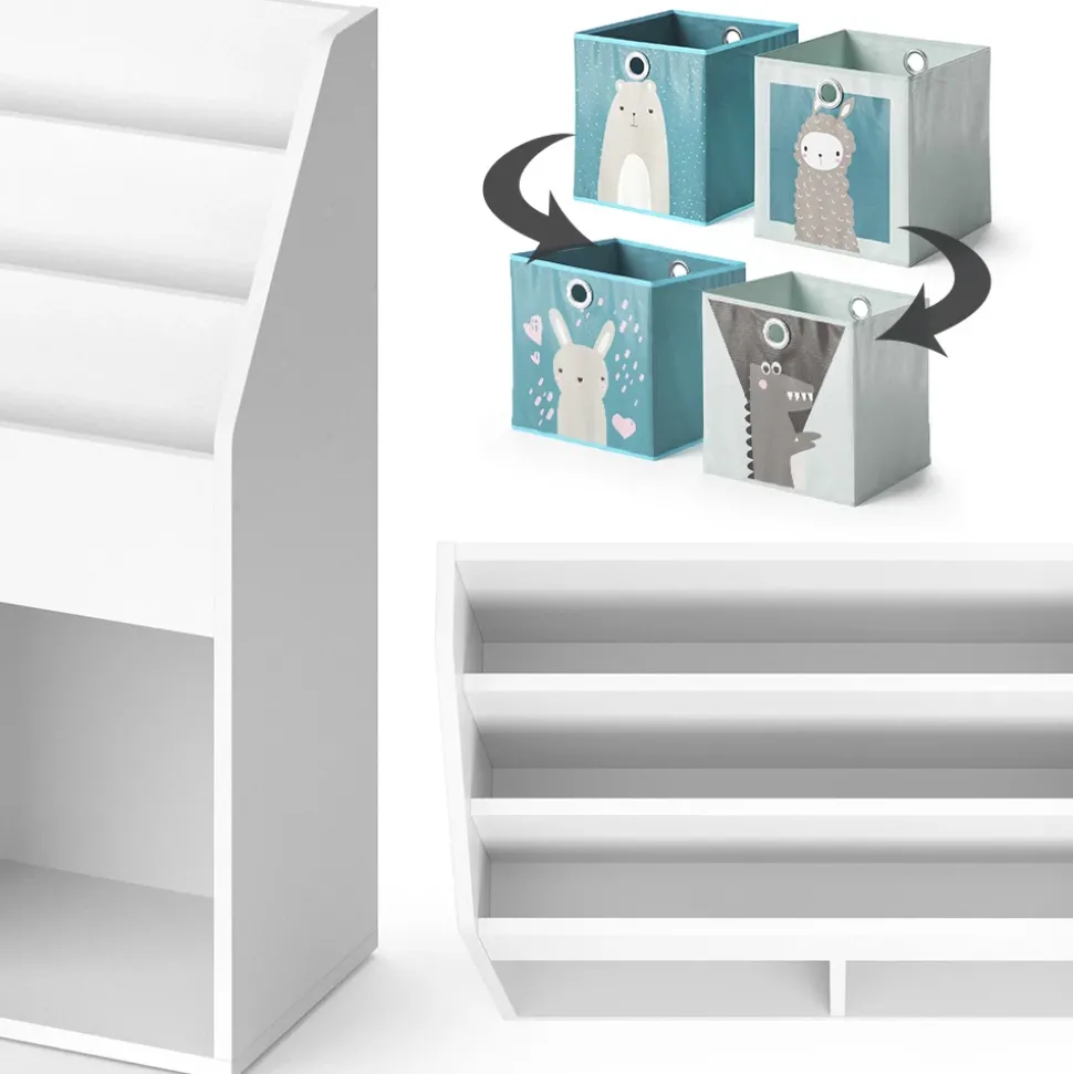 - Das Spielzeugregal für Faltboxen bietet bequeme Aufbewahrungsmöglichkeiten für Bücher und Spielzeug dank drei offener Ablagen und zwei Box-Fächern.
