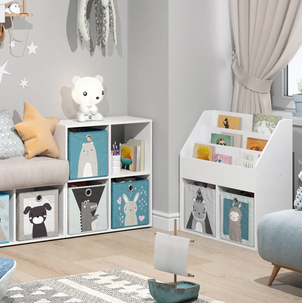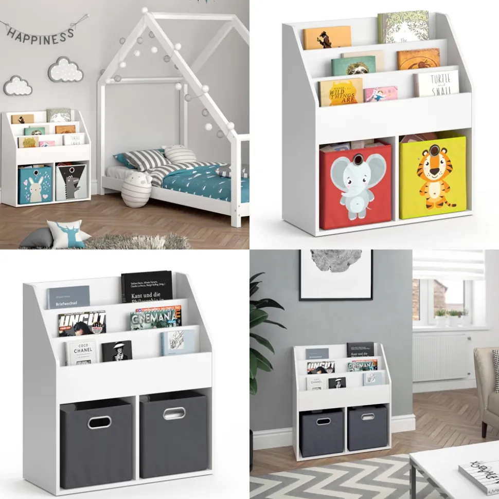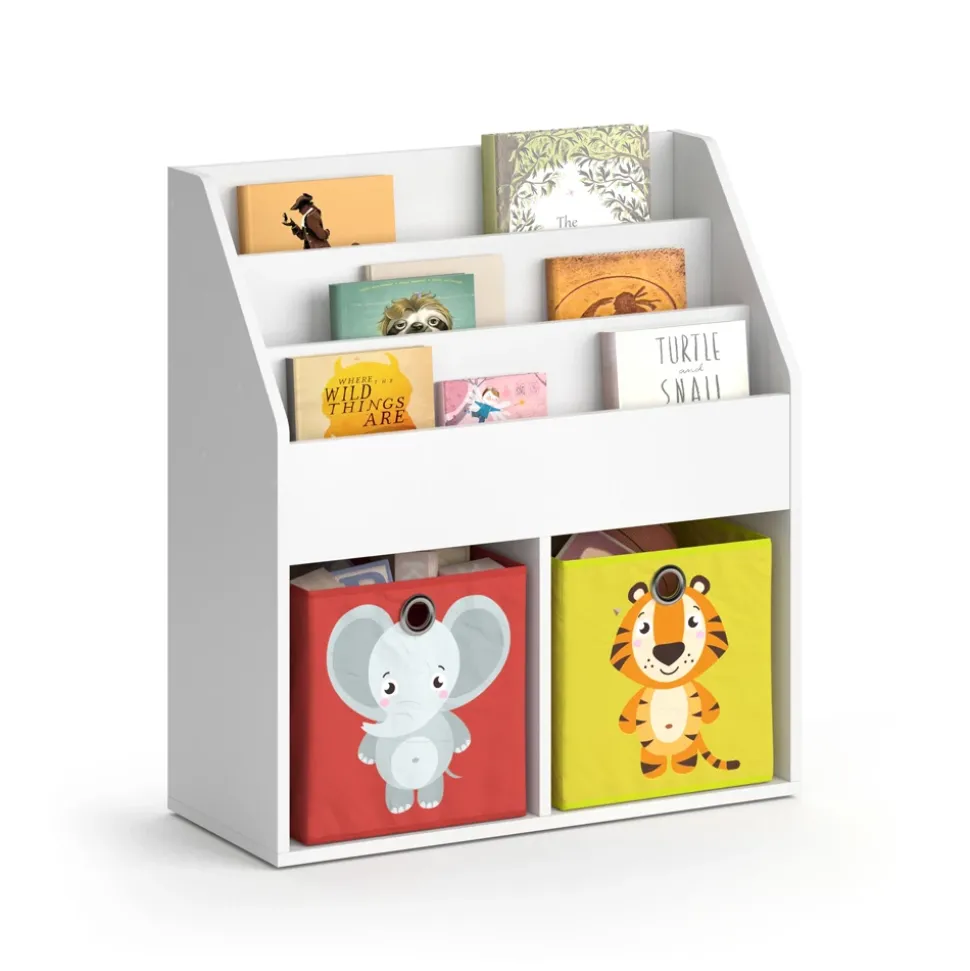- Das Spielzeugregal für Faltboxen bietet bequeme Aufbewahrungsmöglichkeiten für Bücher und Spielzeug dank drei offener Ablagen und zwei Box-Fächern.