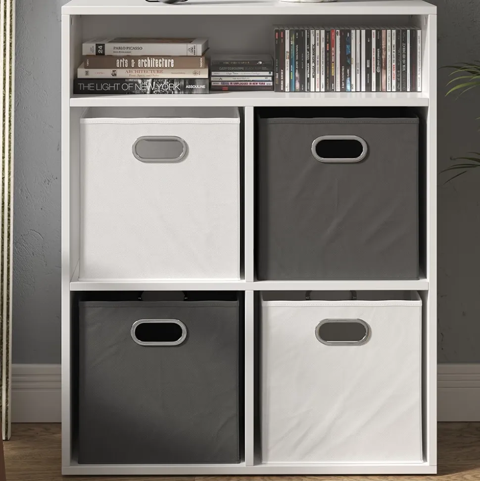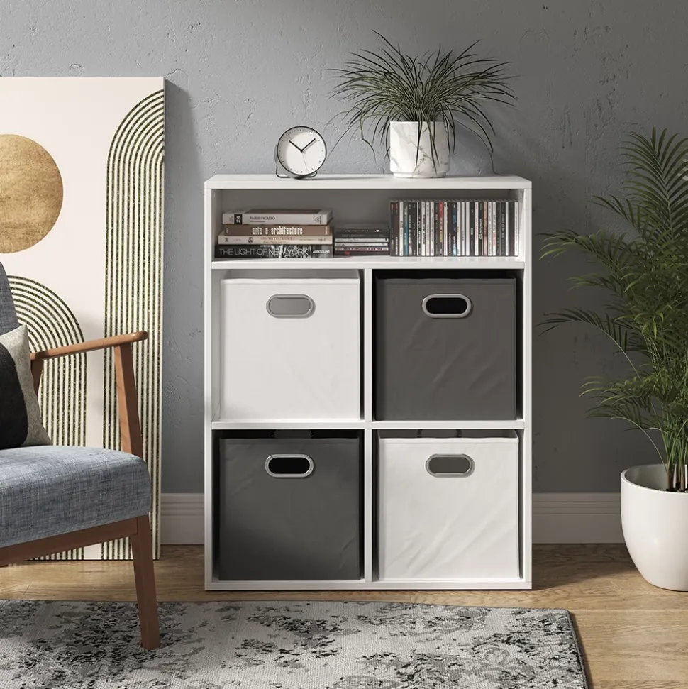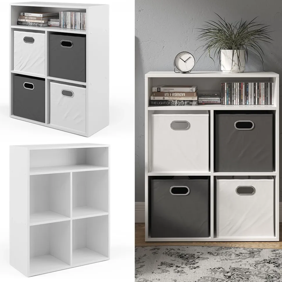 - Das Spielzeugregal für Faltboxen in Weiß bietet mit einem offenen Fachboden und vier Kistenfächern eine bequeme Aufbewahrungsmöglichkeit für Bücher und Spielzeug.