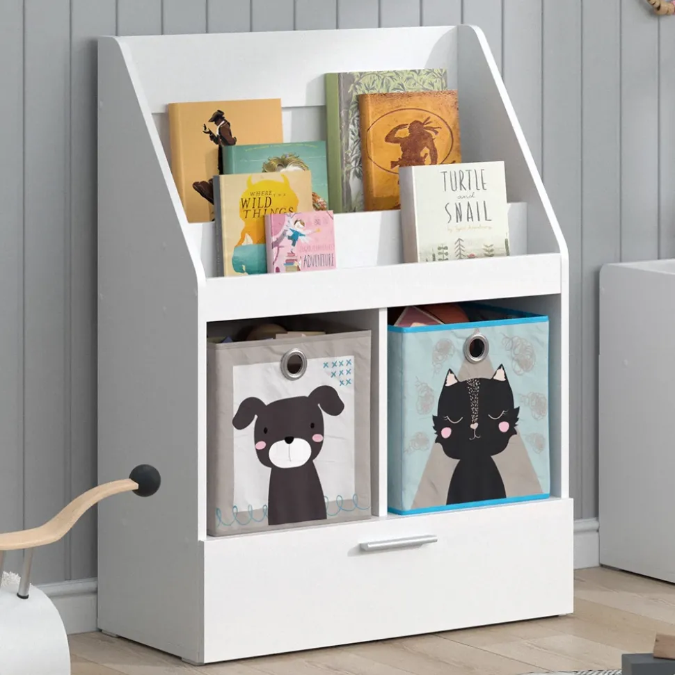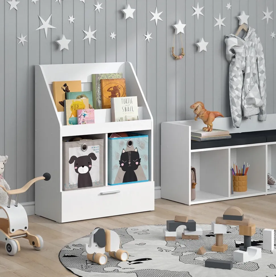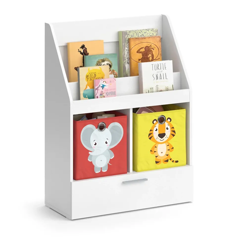 - Das Spielzeugregal für Faltboxen bietet 2 offene Ablagen und 2 Regale für Boxen, sowie eine ausziehbare Schublade zur einfachen Aufbewahrung von Spielzeug.