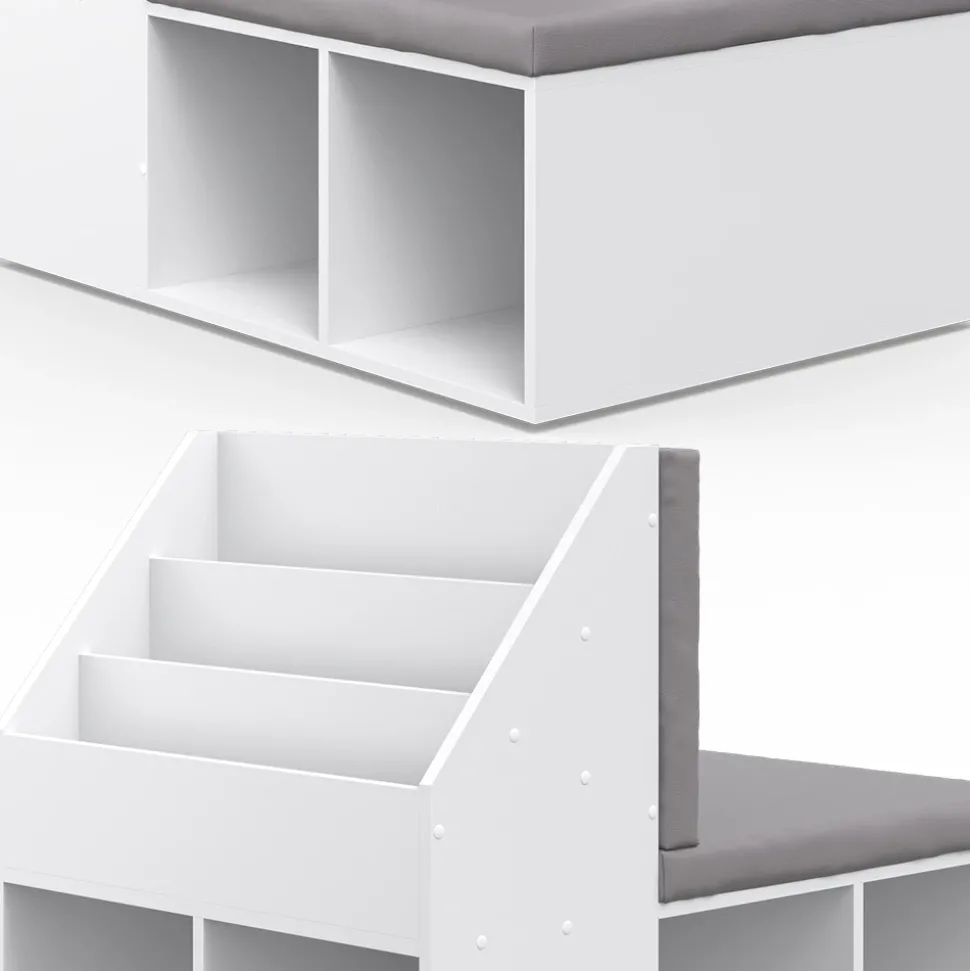 - Das Spielzeugregal für Faltboxen bietet 6 offene Ablagen und bequeme Sitzgelegenheiten mit gepolstertem Sitz – perfekt für eine organisierte Spielzeugaufbewahrung.