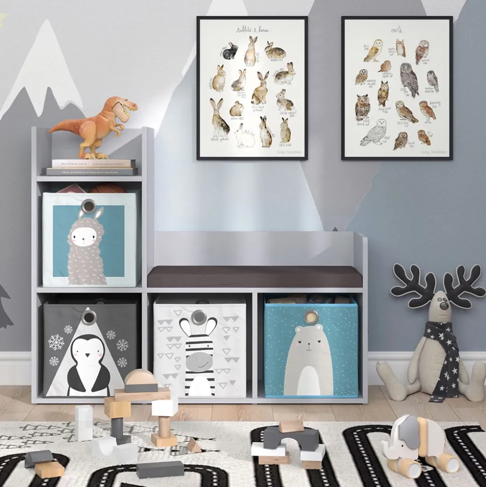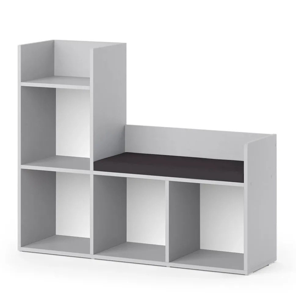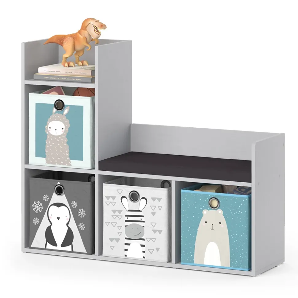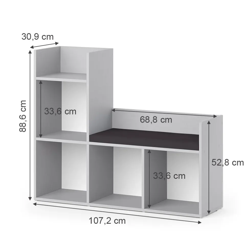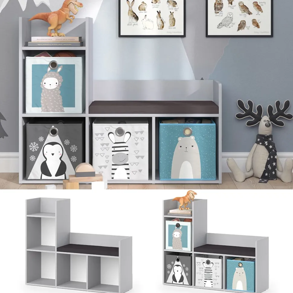 - Das Spielzeugregal mit Sitzbank bietet 4 offene Regale und eine bequeme Sitzgelegenheit mit gepolstertem Sitz.