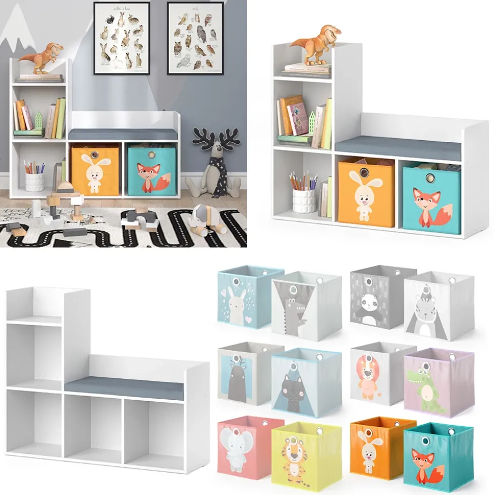 - Das Spielzeugregal mit Sitzbank bietet 4 offene Regale und eine bequeme Sitzgelegenheit mit gepolstertem Sitz.