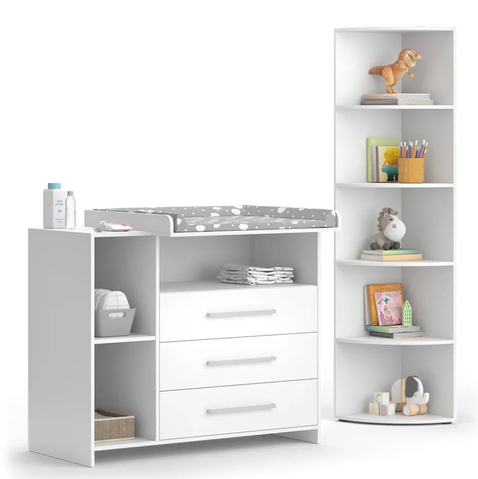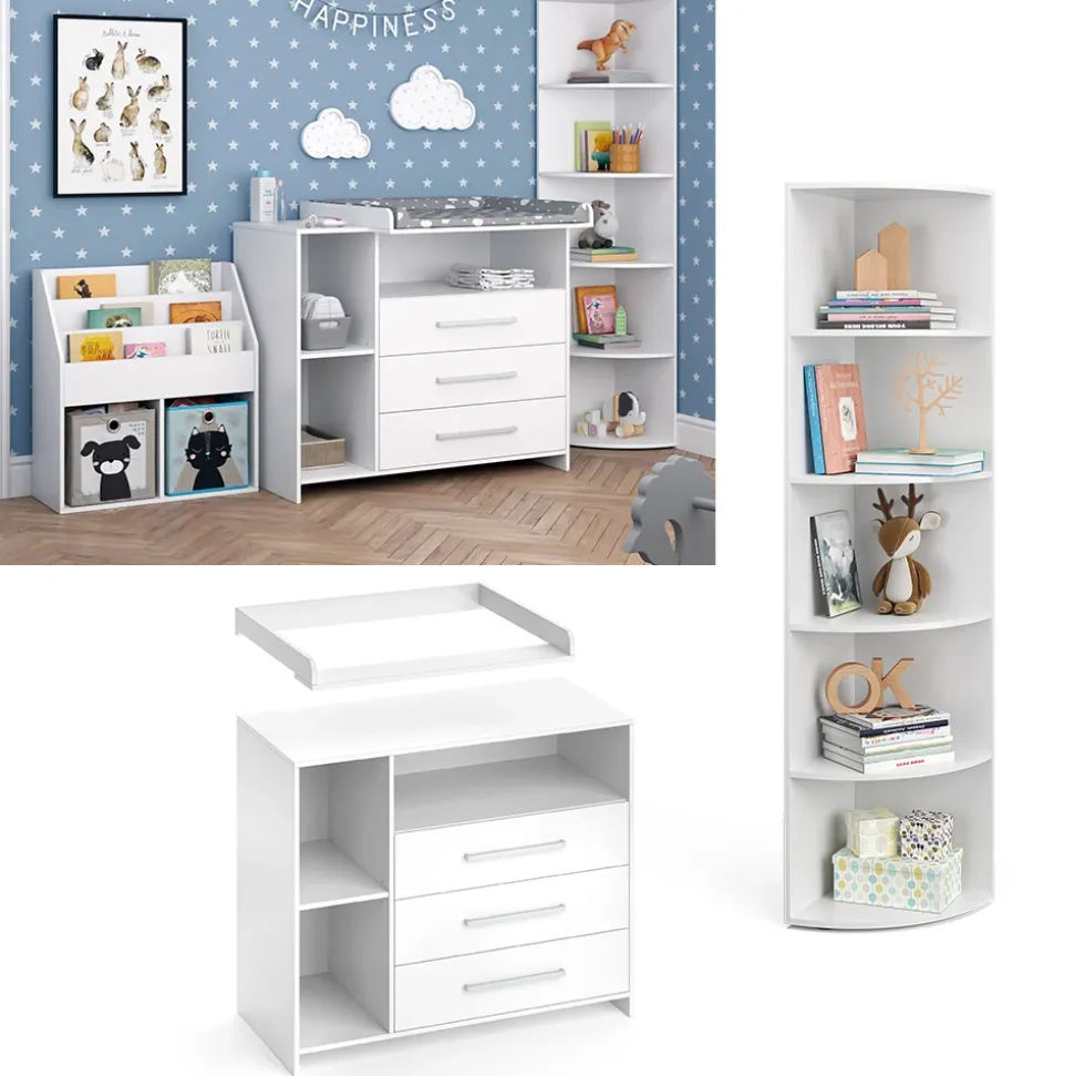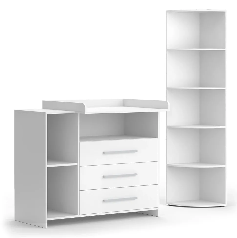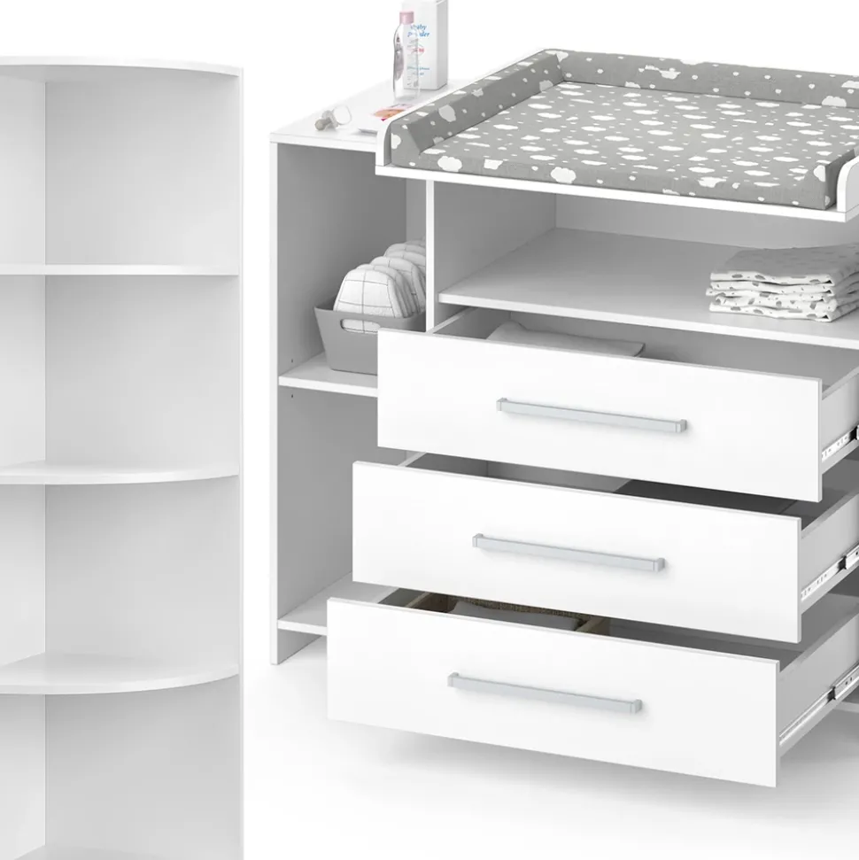 - Die Babyzimmermöbel bieten offene und geschlossene Einlegeböden sowie einen austauschbaren Wickelplatz. Sobald das Kind erwachsen ist, kann die Möbelstück als normale Kommode verwendet werden.