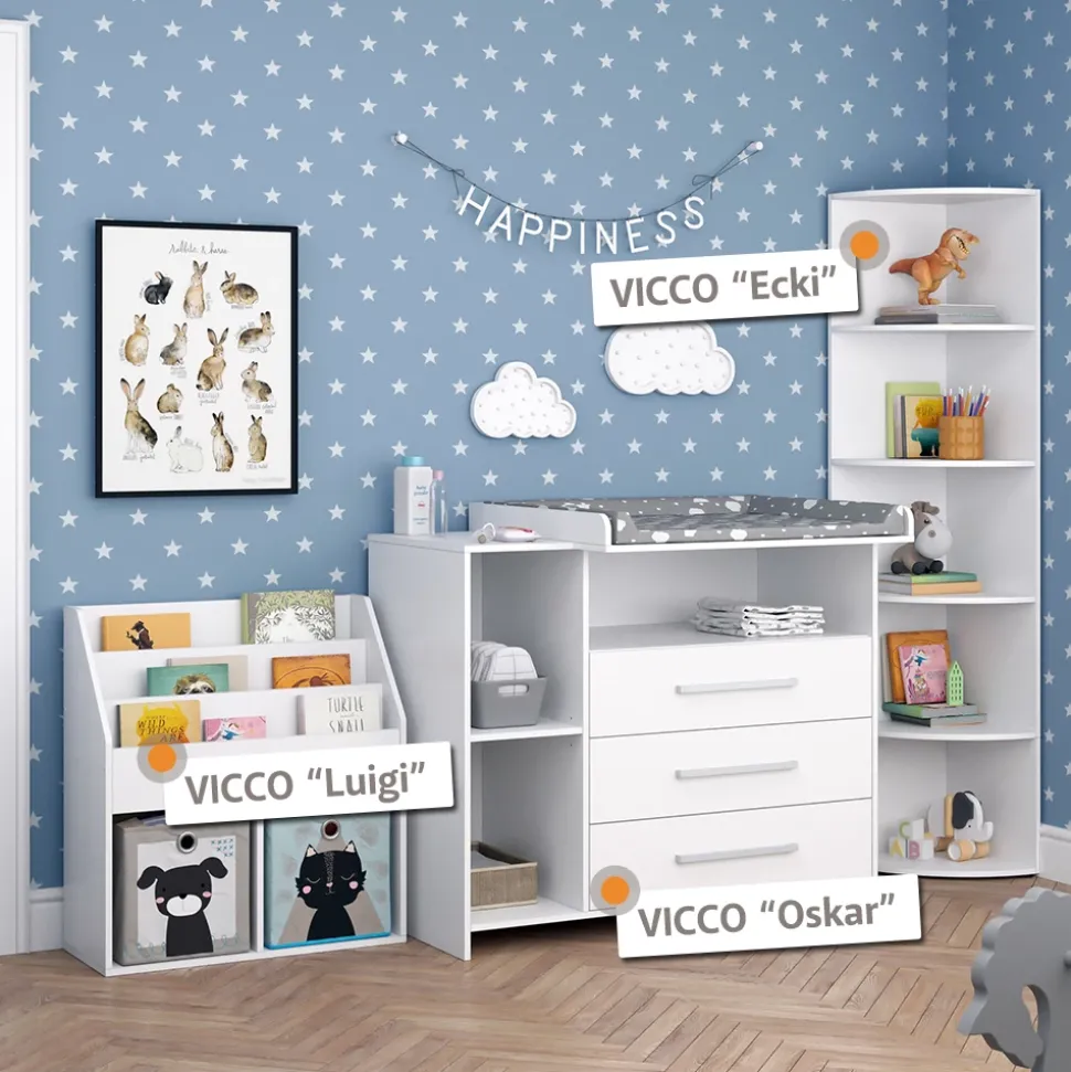 Mit dem Kinderzimmer-Set Oskar wird das Einrichten des Baby- oder Kinderzimmers zum Kinderspiel. Die Möbelserie ist speziell für Kinderzimmer entworfen und bietet eine perfekte Kombination aus Funktionalität und Stil. Die offenen und geschlossenen Einlegeböden sowie der austauschbare Wickelplatz sorgen dafür, dass alle Kleidungsstücke und Accessoires ordentlich verstaut werden können. Doch das Set ist nicht nur für die Kleinen gedacht: Wenn das Kind erwachsen ist, kann es als normale Kommode verwendet werden. Die Kollektion bietet zudem die Möglichkeit, sie mit anderen Artikeln zu kombinieren und somit eine komplett aufeinander abgestimmte Einrichtung zu schaffen. Investieren Sie in das Kinderzimmer-Set Oskar und schenken Sie Ihrem Kind ein gemütliches und funktionales Zuhause.