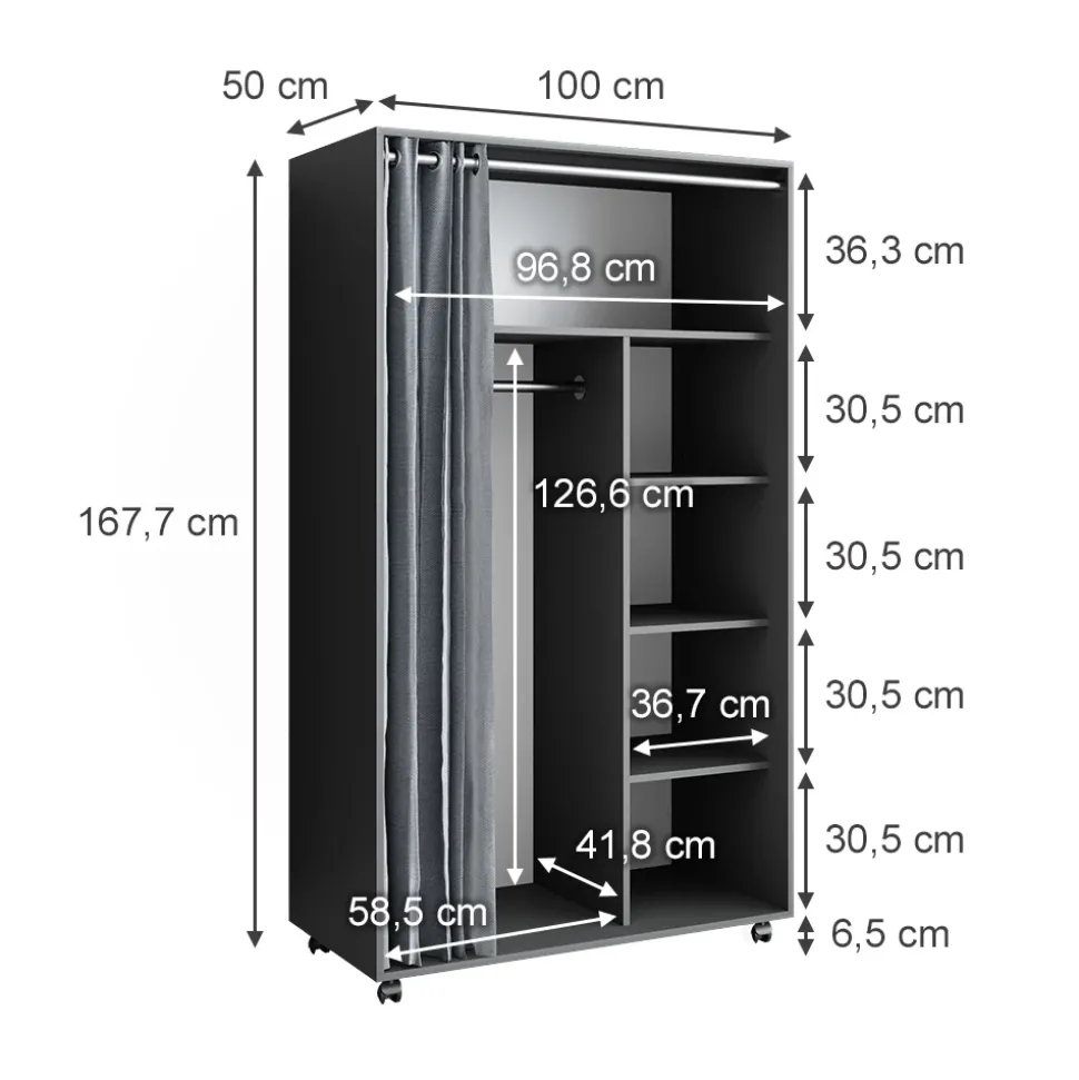 Egal ob Schlafzimmer, Kinderzimmer oder Flur – Doros lässt sich schnell und einfach an jeden beliebigen Ort rollen und bietet durch die diversen Fächer und der Kleiderstange viel Stauraum. Dank seines Vorhangs ermöglicht Ihnen der Schrank eine staubfreie und saubere Lagerung all Ihrer Kleidung. Möchten Sie Auflockerung und ein offenes Raumgefühl in Ihre vier Wände bringen, kann der Schrank auch ohne Vorhang aufgestellt werden.