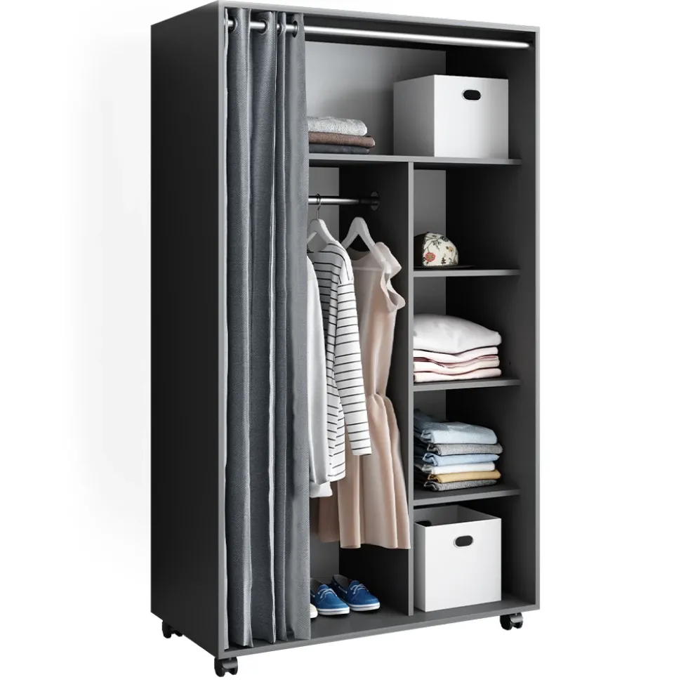 - Der Flügeltürenschrank verfügt über offene Regale, eine Aufhängestange und Laufrollen für Flexibilität und einfache Handhabung.