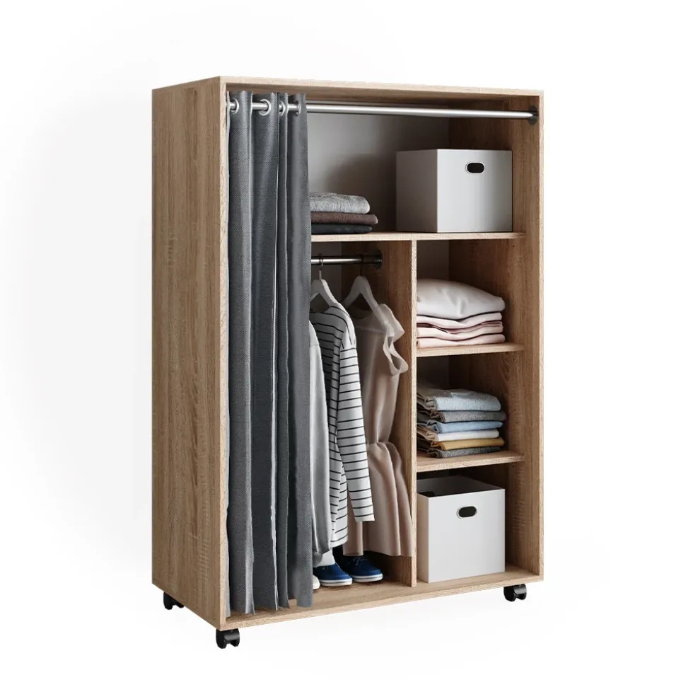 Egal ob Schlafzimmer, Kinderzimmer oder Flur – Doros lässt sich schnell und einfach an jeden beliebigen Ort rollen und bietet durch die diversen Fächer und der Kleiderstange viel Stauraum. Dank seines Vorhangs ermöglicht Ihnen der Schrank eine staubfreie und saubere Lagerung all Ihrer Kleidung. Möchten Sie Auflockerung und ein offenes Raumgefühl in Ihre vier Wände bringen, kann der Schrank auch ohne Vorhang aufgestellt werden.
