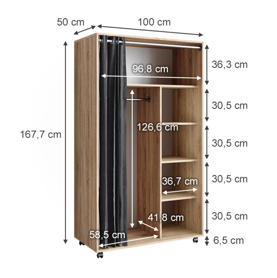 - MAßE: Der Kleiderschrank für Kinder hat folgende Abmessungen: Breite: 100 cm, Höhe: 168 cm, Tiefe: 50 cm. Alle detaillierten Größen sind auf den Fotos angegeben.