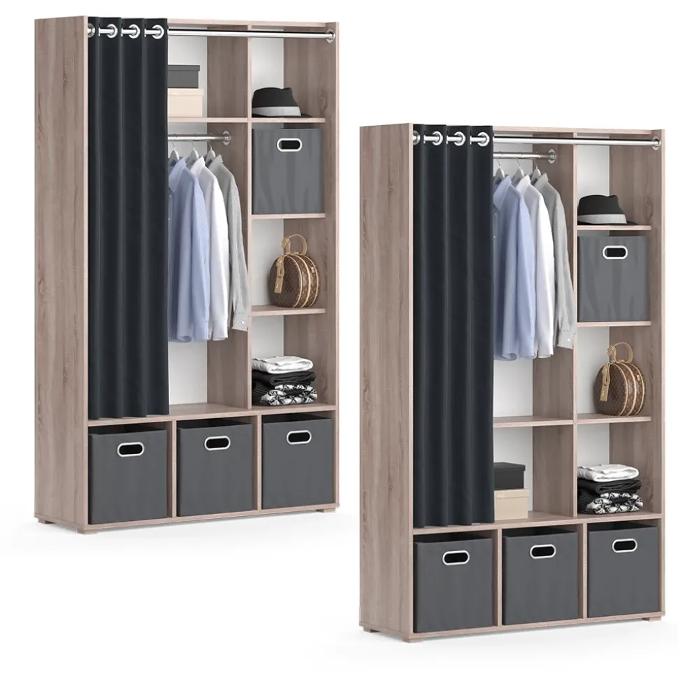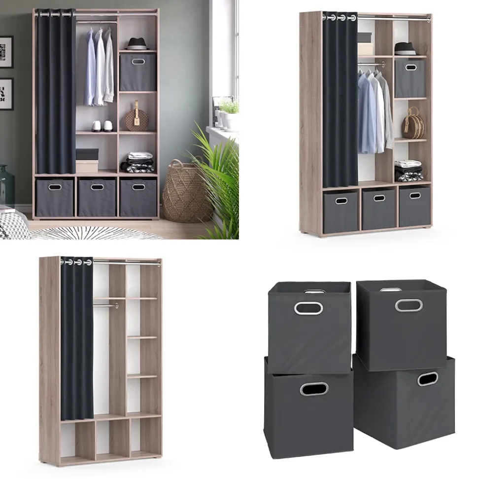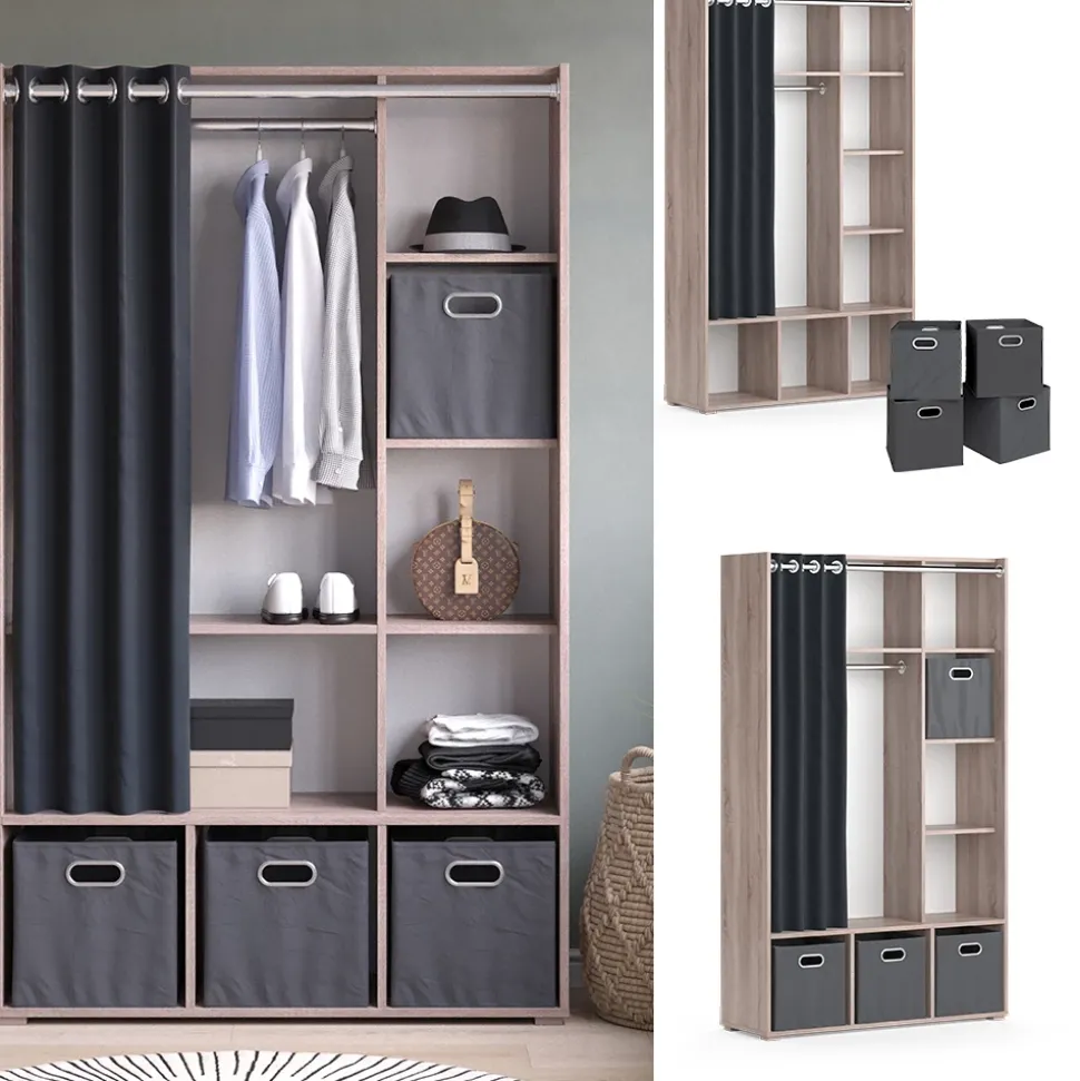 - Durch seine Melaminharzbeschichtung bietet unser Kleiderschrank Luigi eine pflegeleichte Oberfläche. Der Vorhang ist ebenfalls aus einem robusten Stoff gefertigt. Das zusätzlich enthaltene Faltboxen 4er-Set bietet ergänzenden Stauraum und ist ebenfalls sehr leicht in der Pflege.
