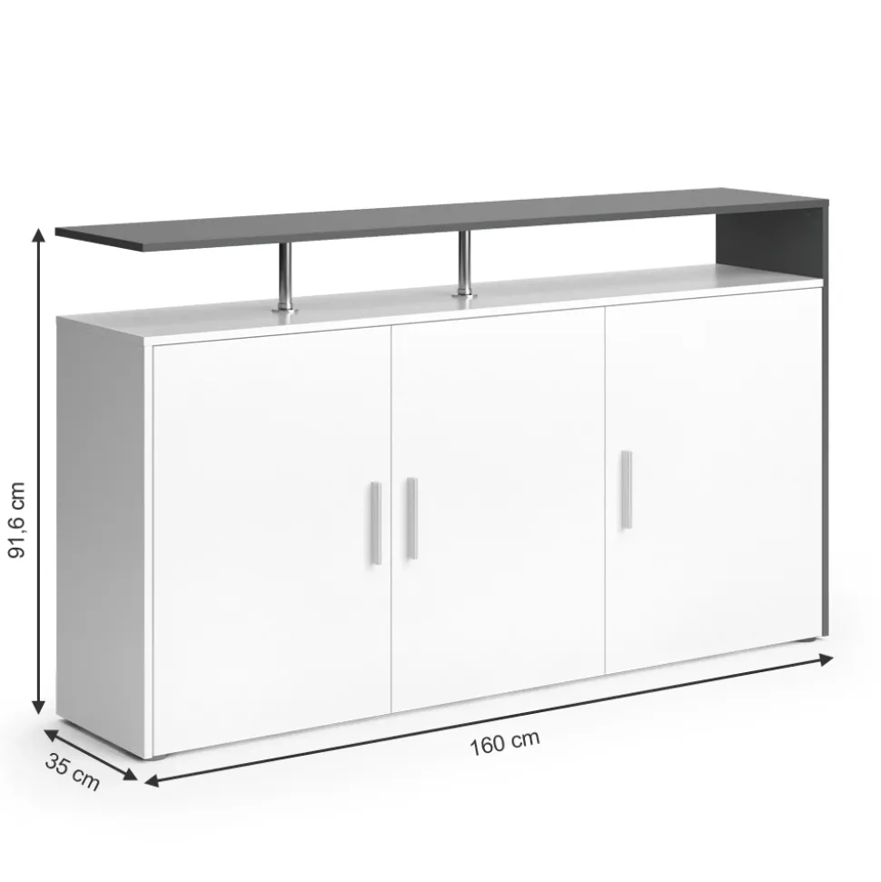 - MAßE: Die Kommode mit Türen hat eine Breite von 160 cm, eine Höhe von 91,6 cm und eine Tiefe von 35 cm. Alle detaillierten Größen sind auf den Fotos angegeben.